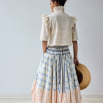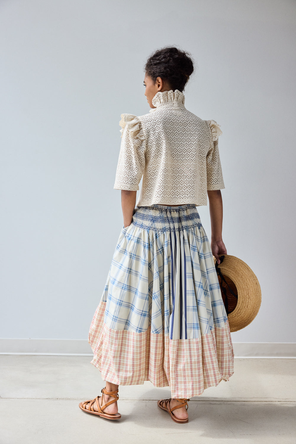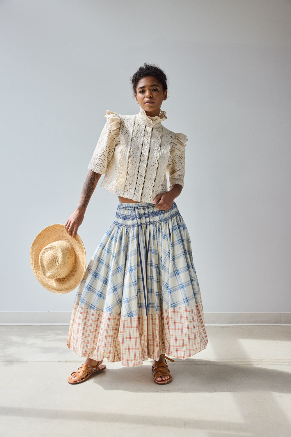 • Bubble hem midi skirt with smocking detail at yoke, fully lined with cotton lawn and side seam pockets.