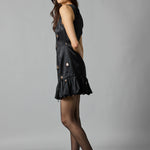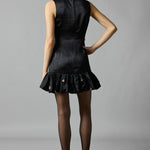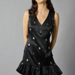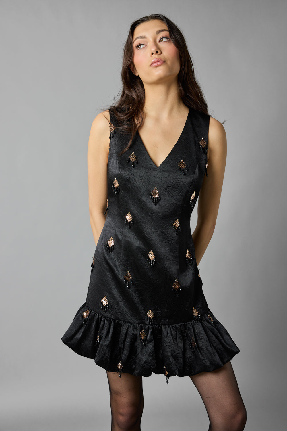 • Sleeveless, body skimming V-neck dress with beautiful sequined and hand-beaded embellishments on the body and flounced hem.