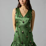 • Sleeveless, body skimming V-neck dress with beautiful sequined and hand-beaded embellishments on the body and flounced hem.