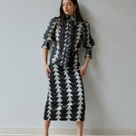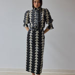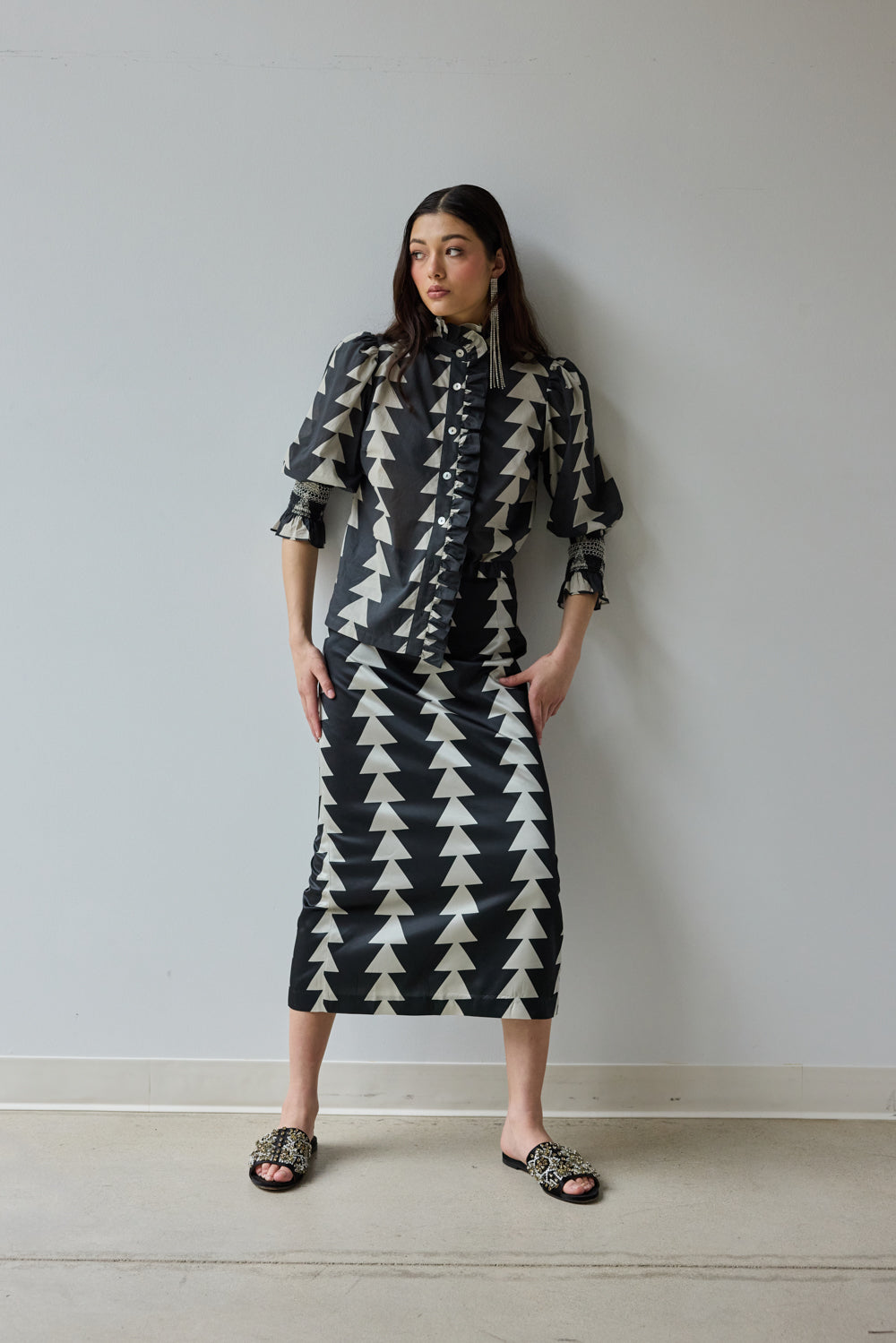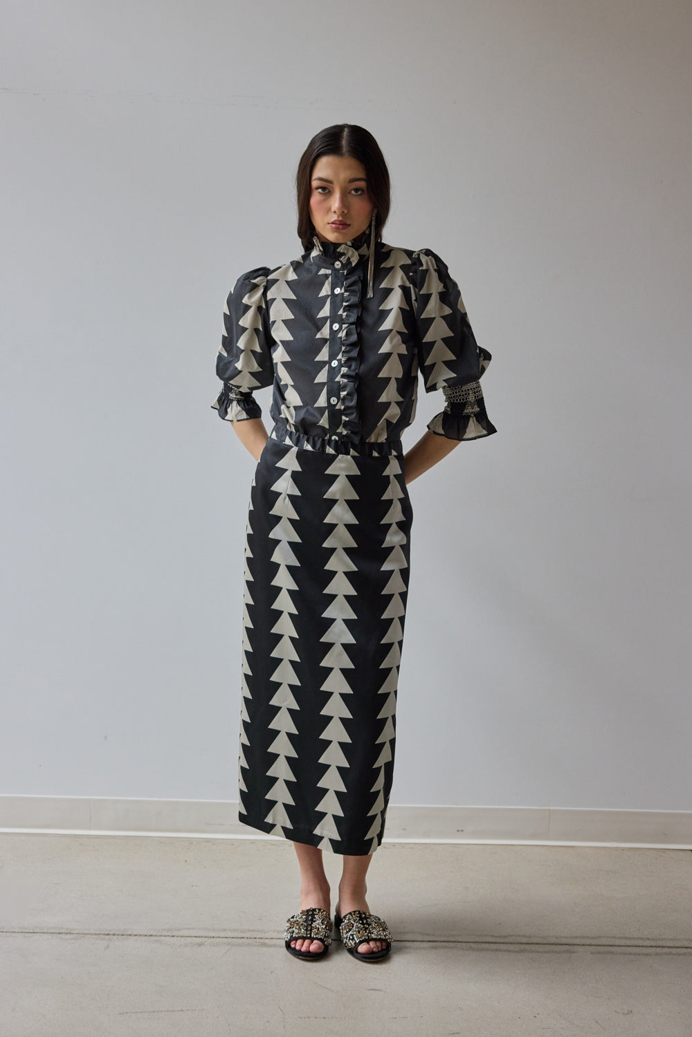 • Button down shirt with frill detailing at the collar continuing down the front placket, has modestly puffed sleeves with smocking at cuffs.