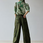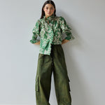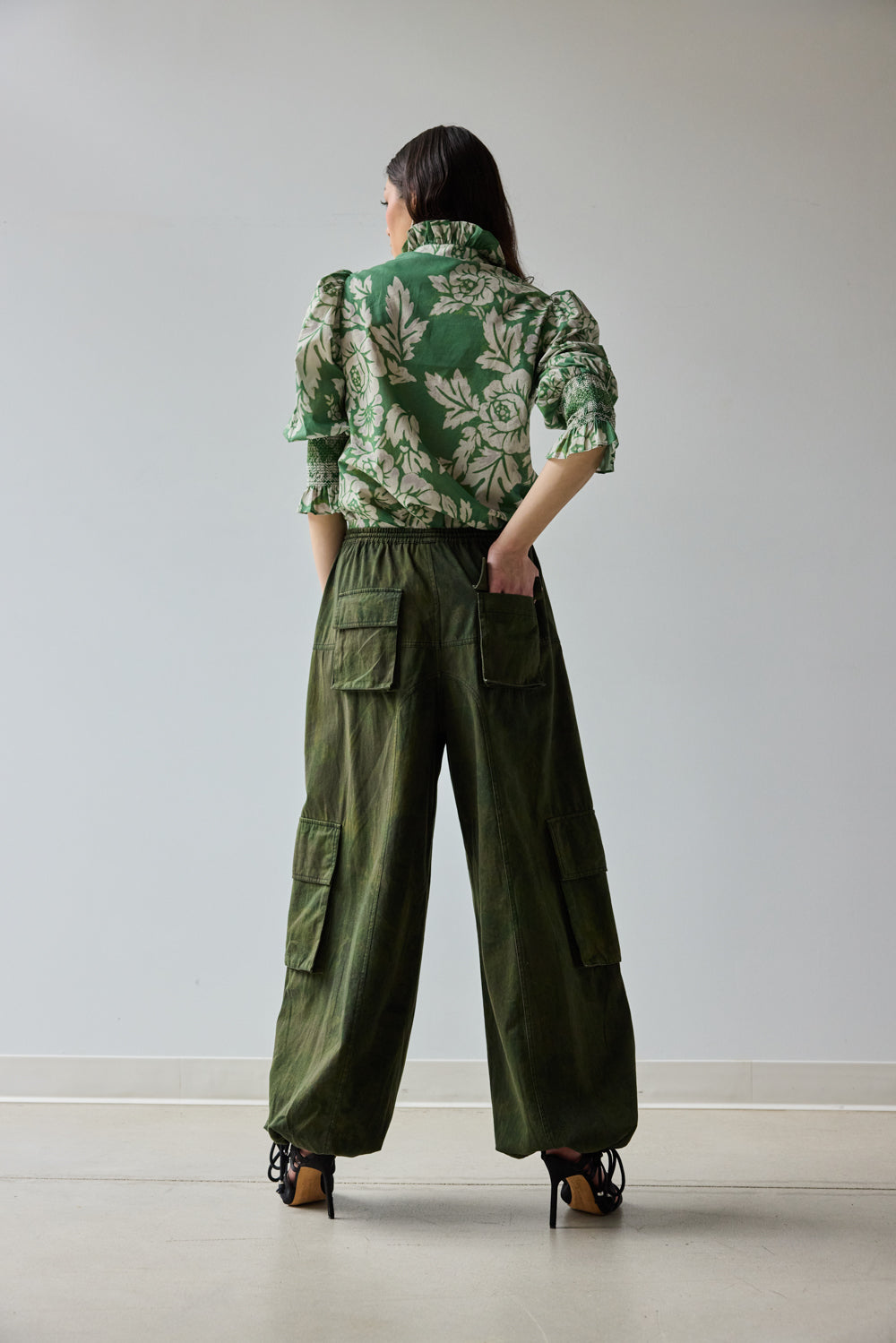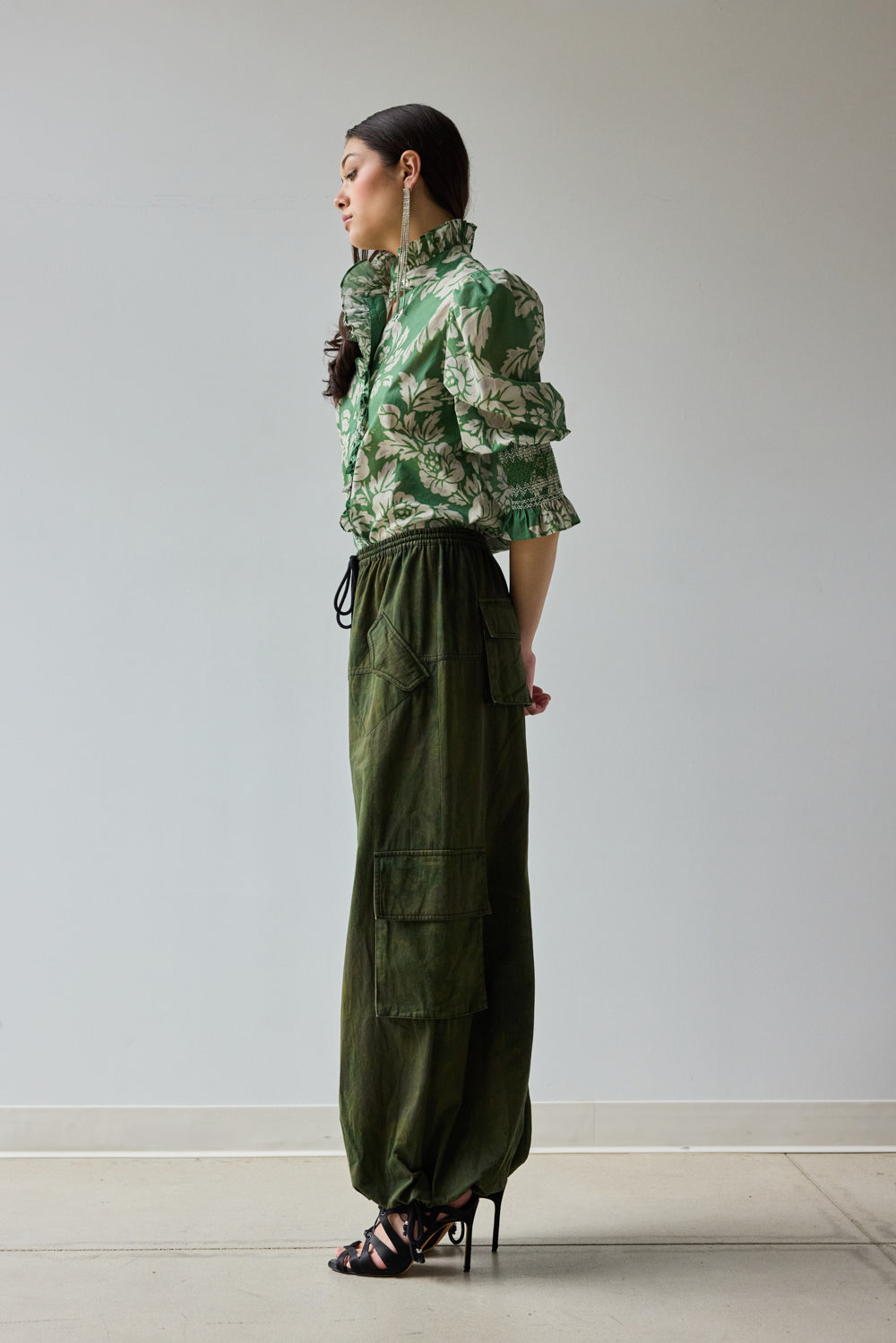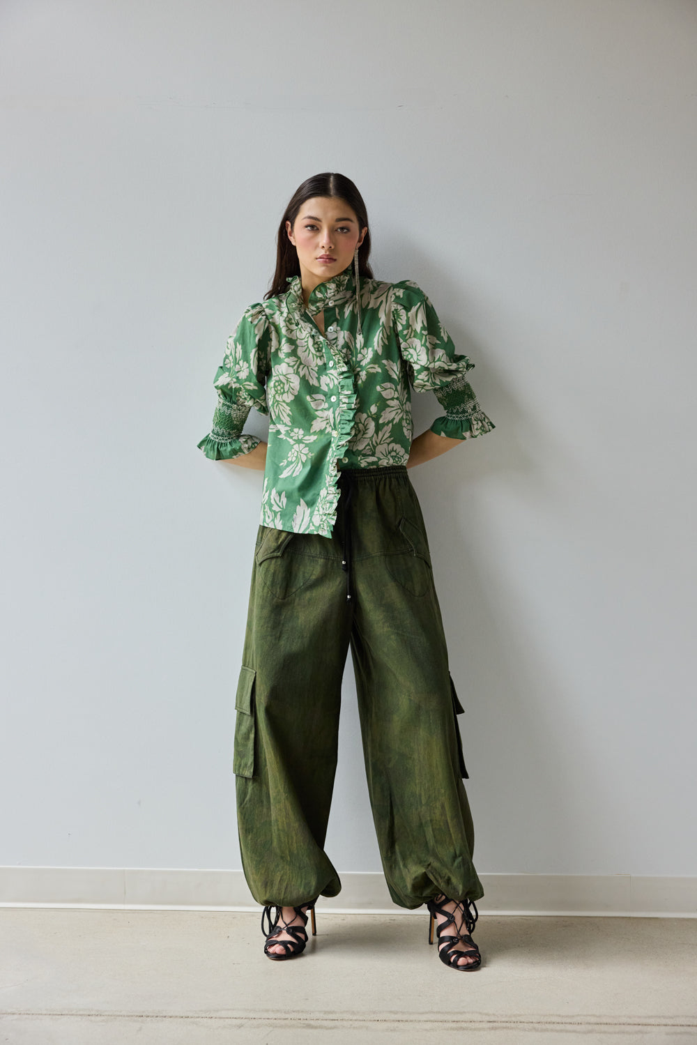 • Button down shirt with frill detailing at the collar continuing down the front placket, has modestly puffed sleeves with smocking at cuffs.