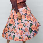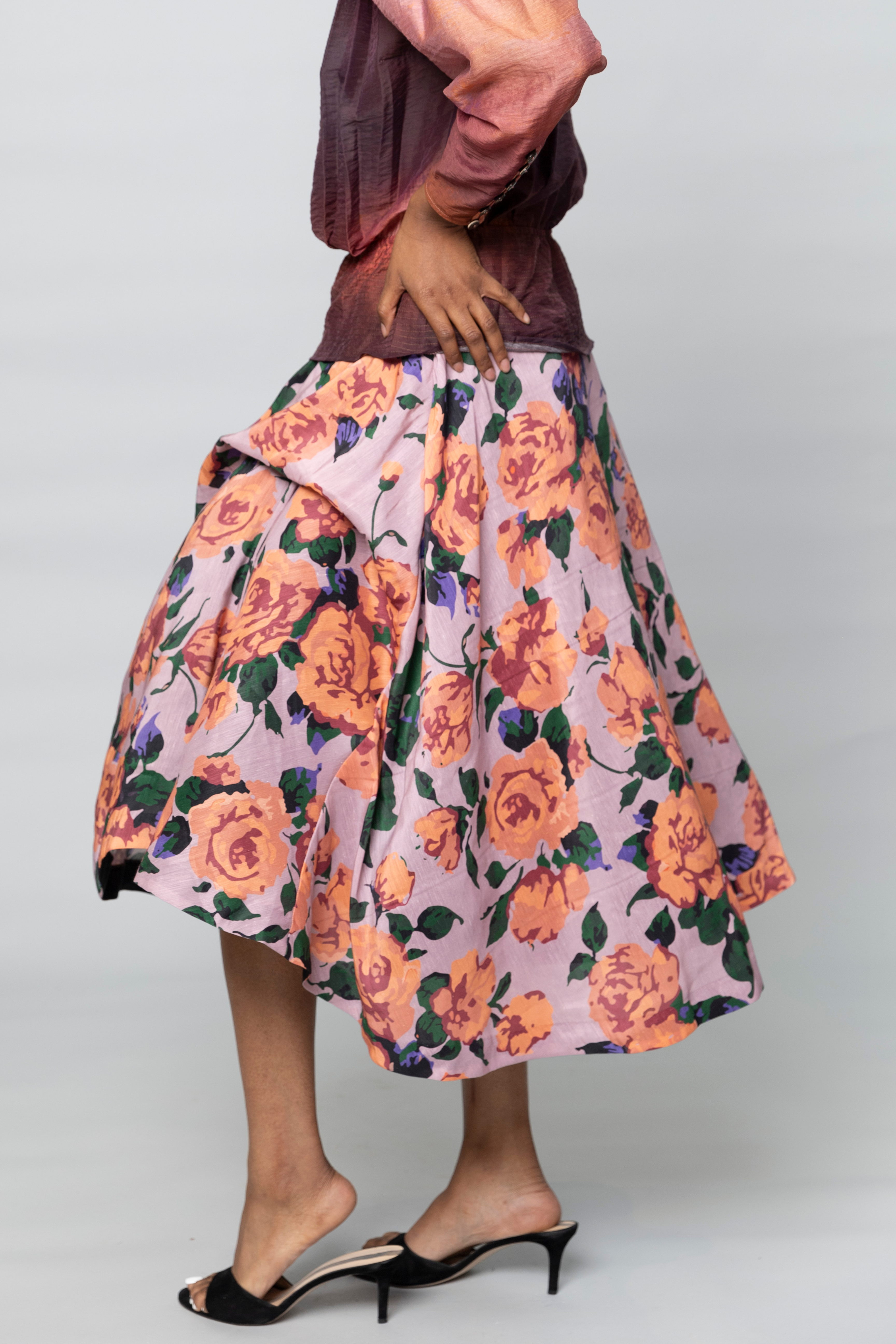 • Flared mid-length skirt in luxurious silk and linen blend. Pick-up at wearer’s left adds drama and dimension to a classic silhouette . Elastic at back waist for comfortable fit.
