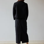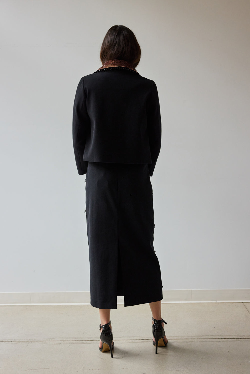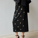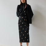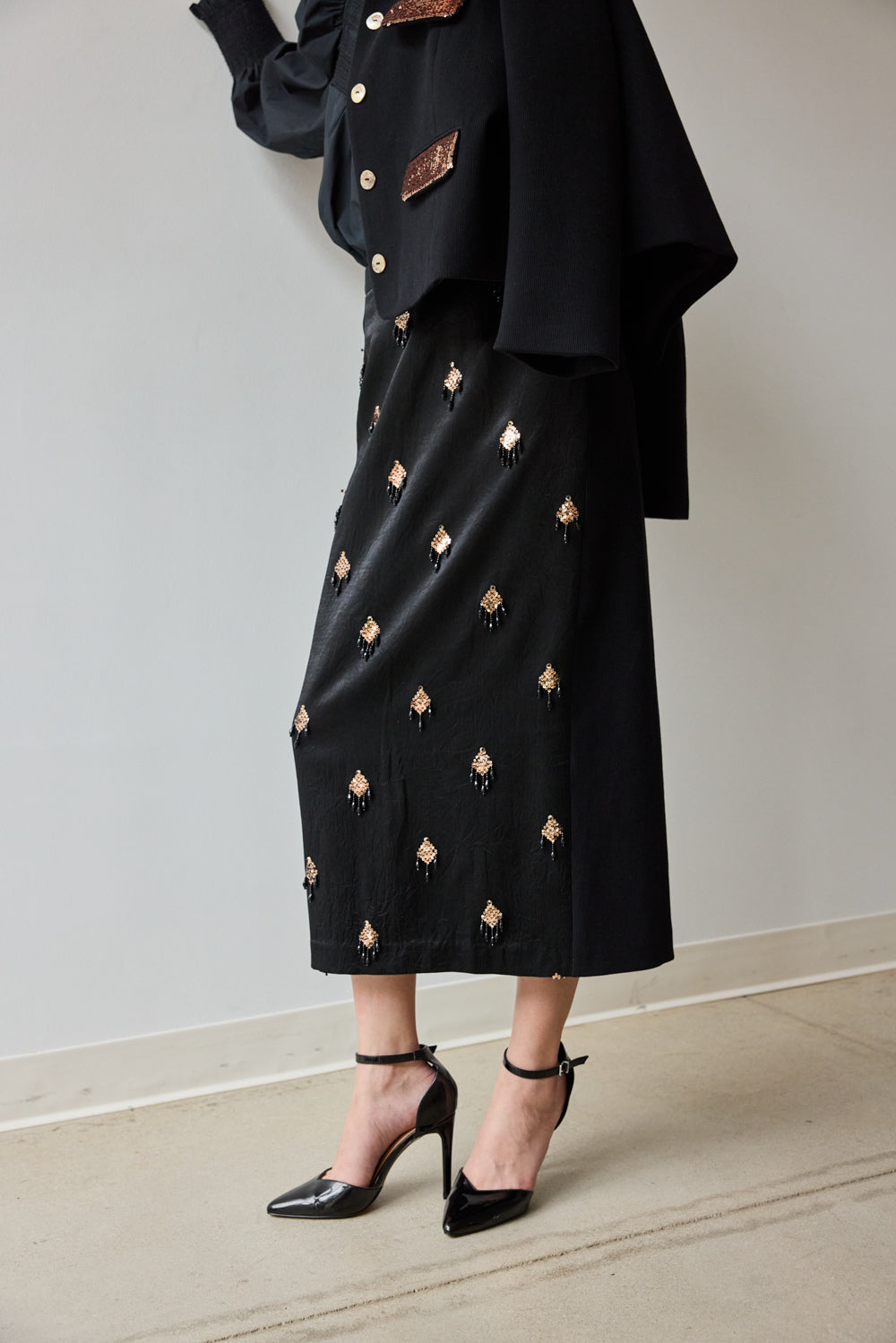• Fitted pencil skirt in Naia satin with beautiful sequined and hand-beaded embellishments at the front and organic cotton knit at the back . The skirt has front and back darts, a slit at center back and an elasticated back waist for flexible fit.