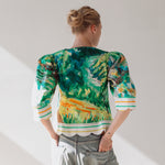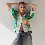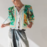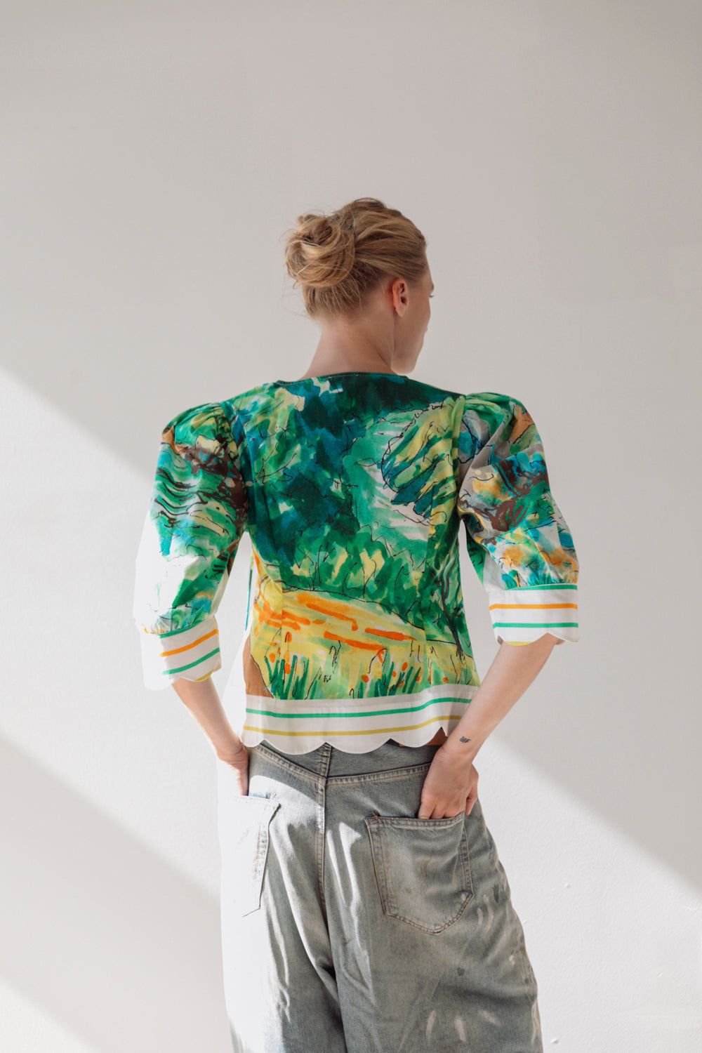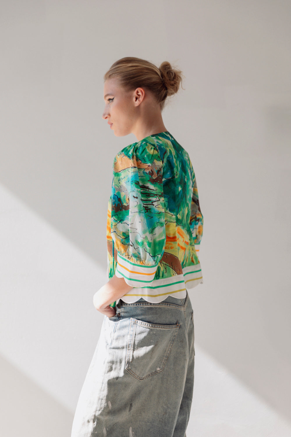 • Relaxed fit blouse in organic cotton eyelet  with ties at neckline, buttons at center front and scallop detailing at sleeves and blouse hem