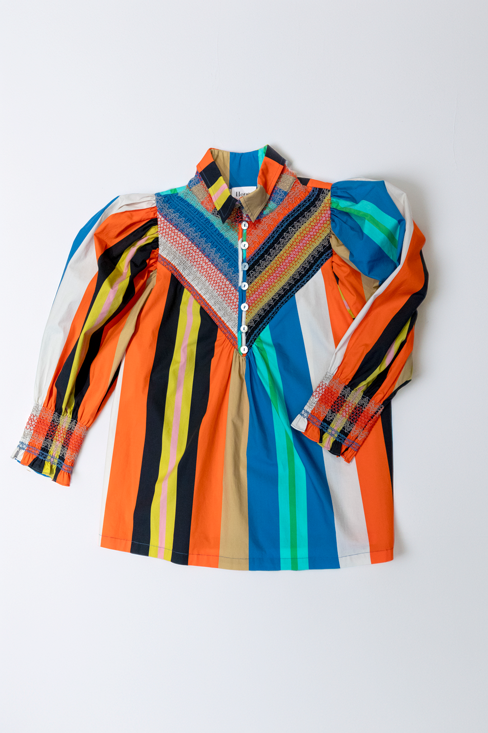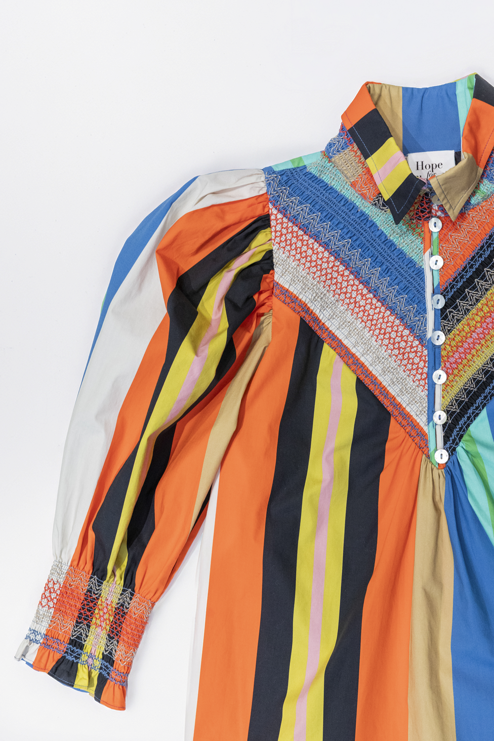 • Our classic Hope for Flowers smocked shirt in a crisp organic cotton poplin has a smocked front yoke, tailored collar details. Full statement sleeves have smocked cuffs.