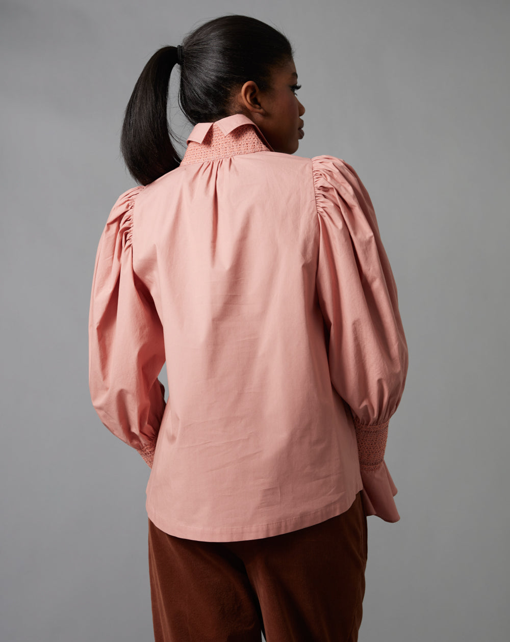 • A Hope for Flowers best seller. This shirt has a smocked yoke, full length flounced sleeves smocked at the wrists, and Akoya shell buttons at front placket