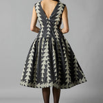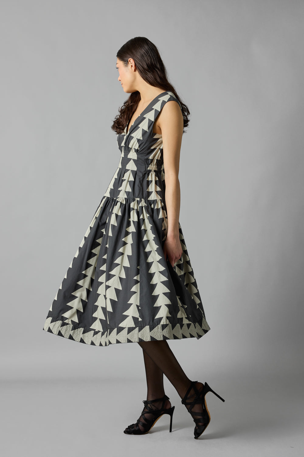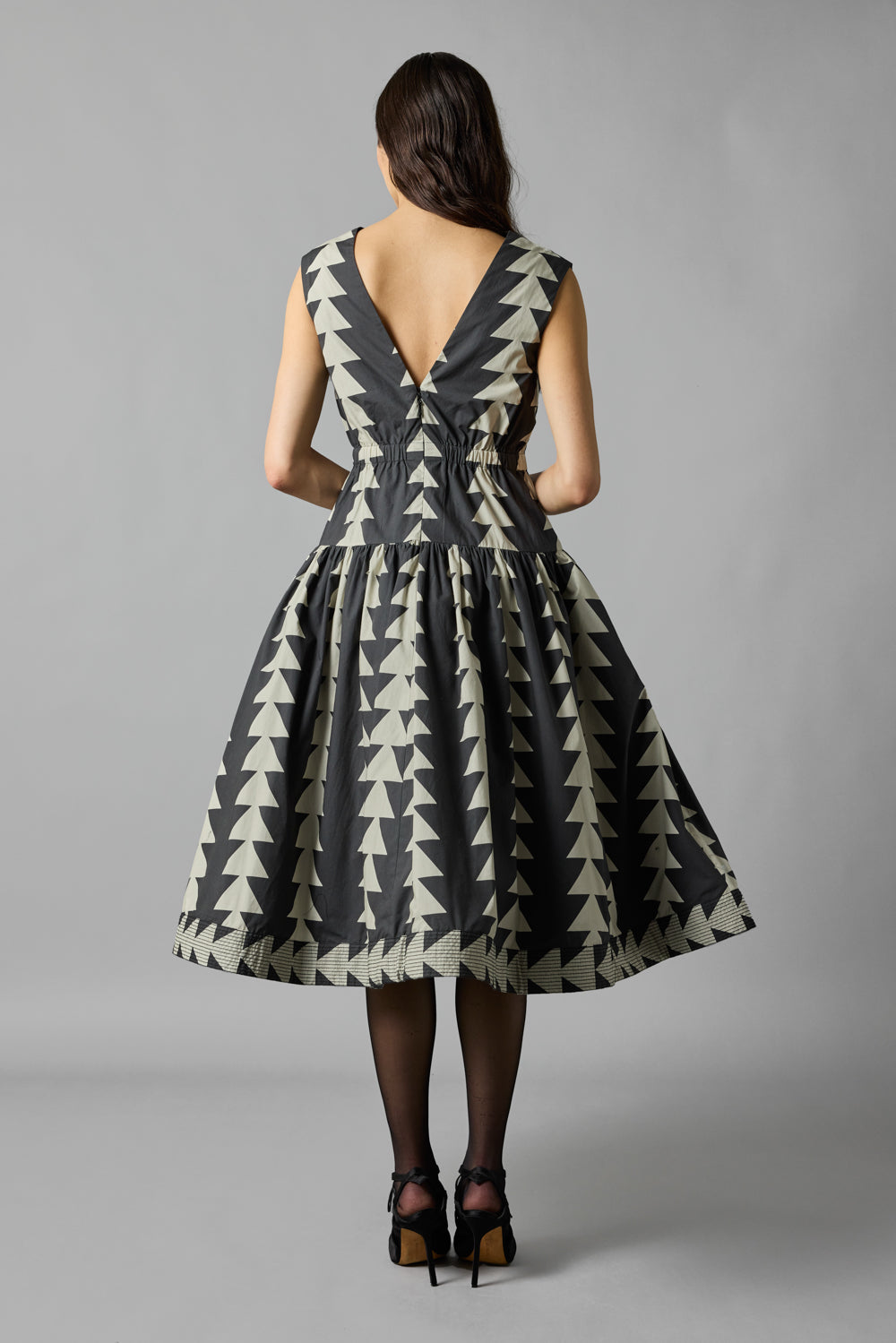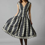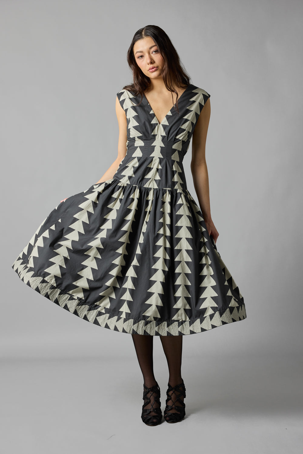 • Our midi length, v-neck fit & flare dress has tucks at the waist that release under the bust. The full skirt has side seam pockets and a petticoat lining
