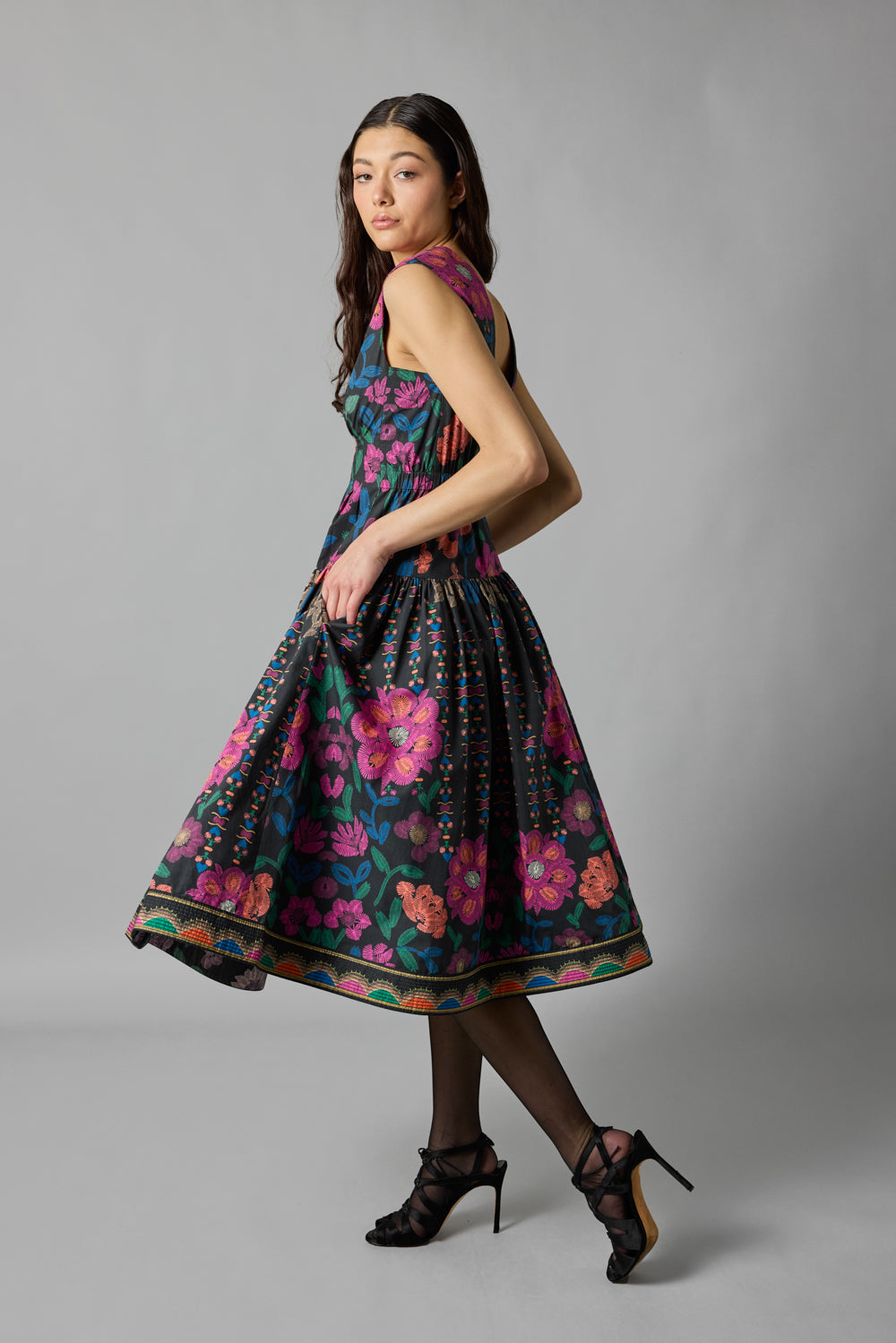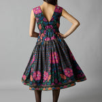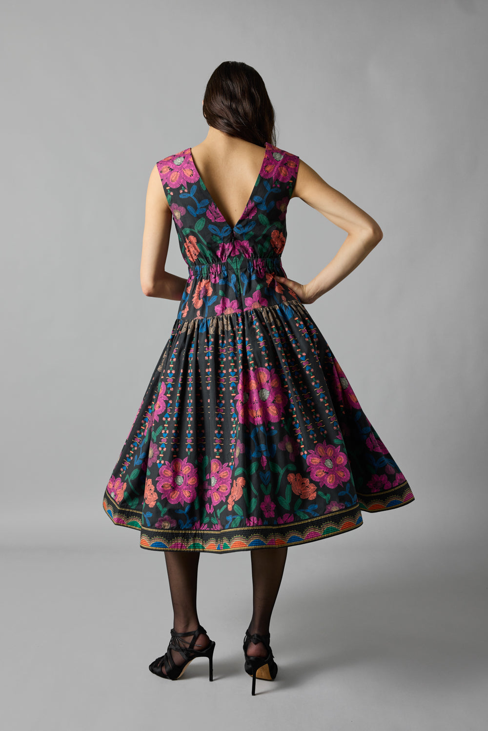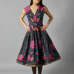 • Our midi length, v-neck fit & flare dress has tucks at the waist that release under the bust. The full skirt has side seam pockets and a petticoat lining