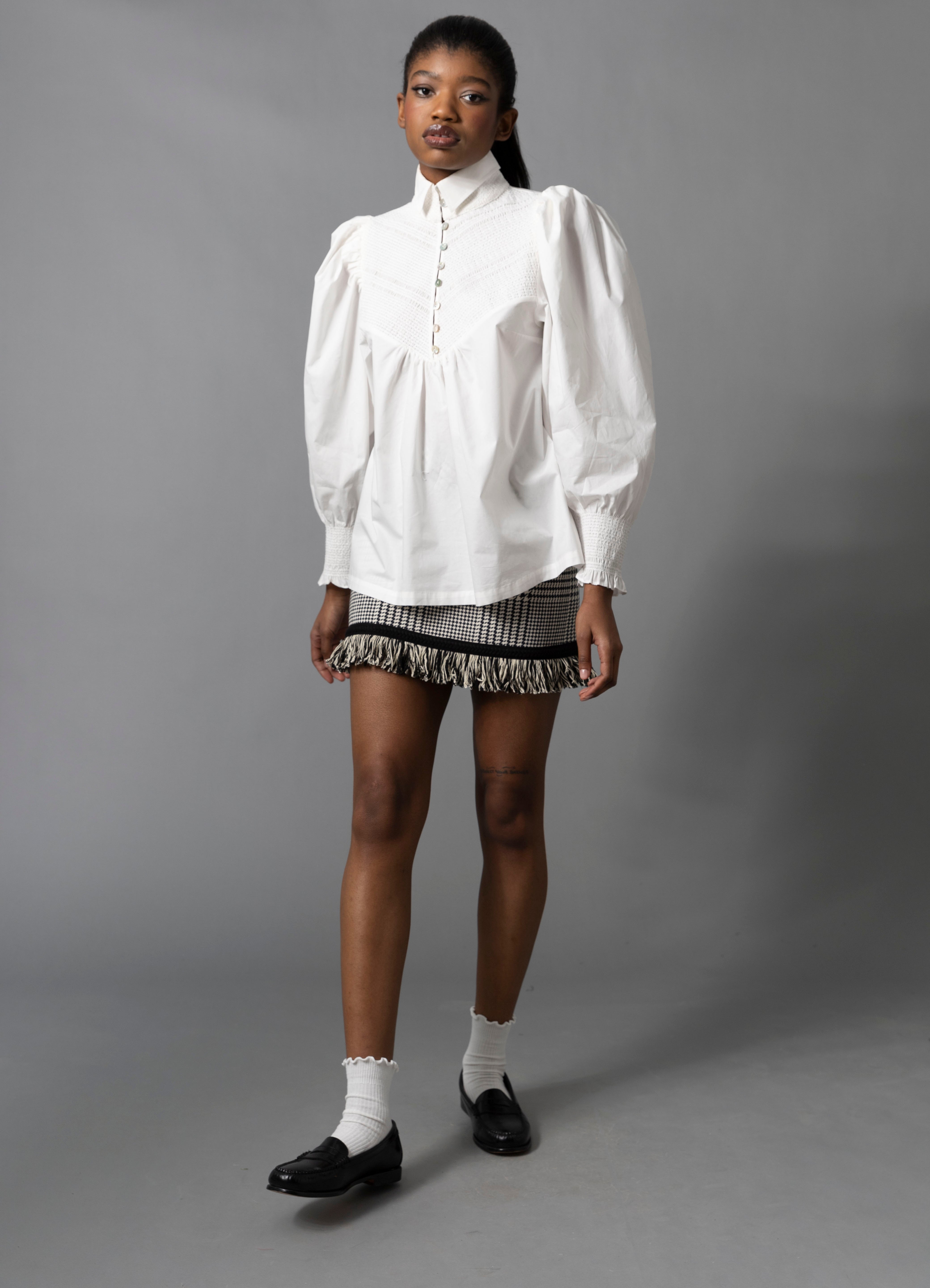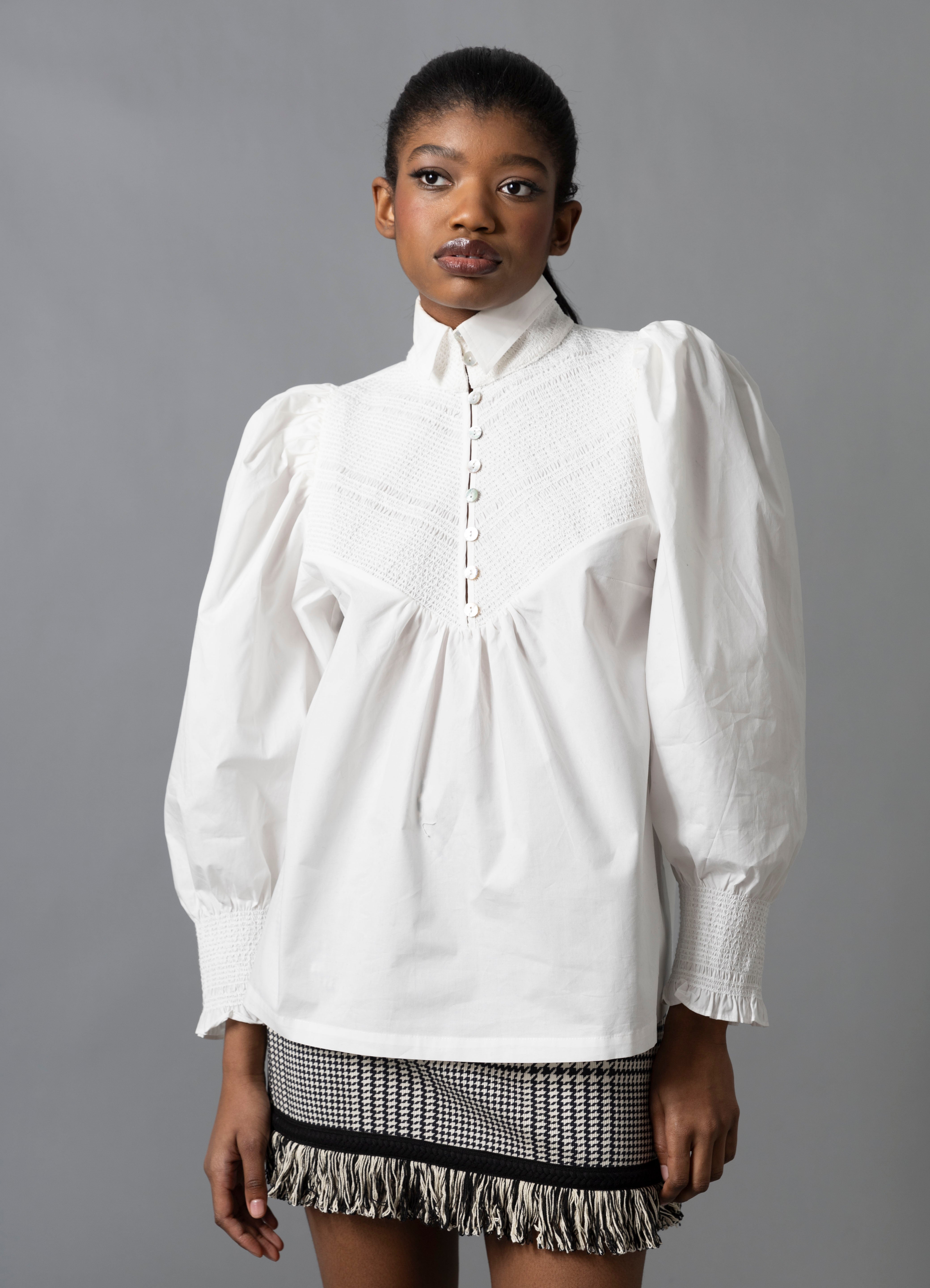 • A Hope for Flowers best seller in timeless solid ivory or black organic cotton. Our favorite shirt has a smocked yoke and cuffs with puffed sleeves and Akoya shell buttons at the front placket.
