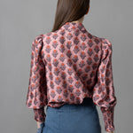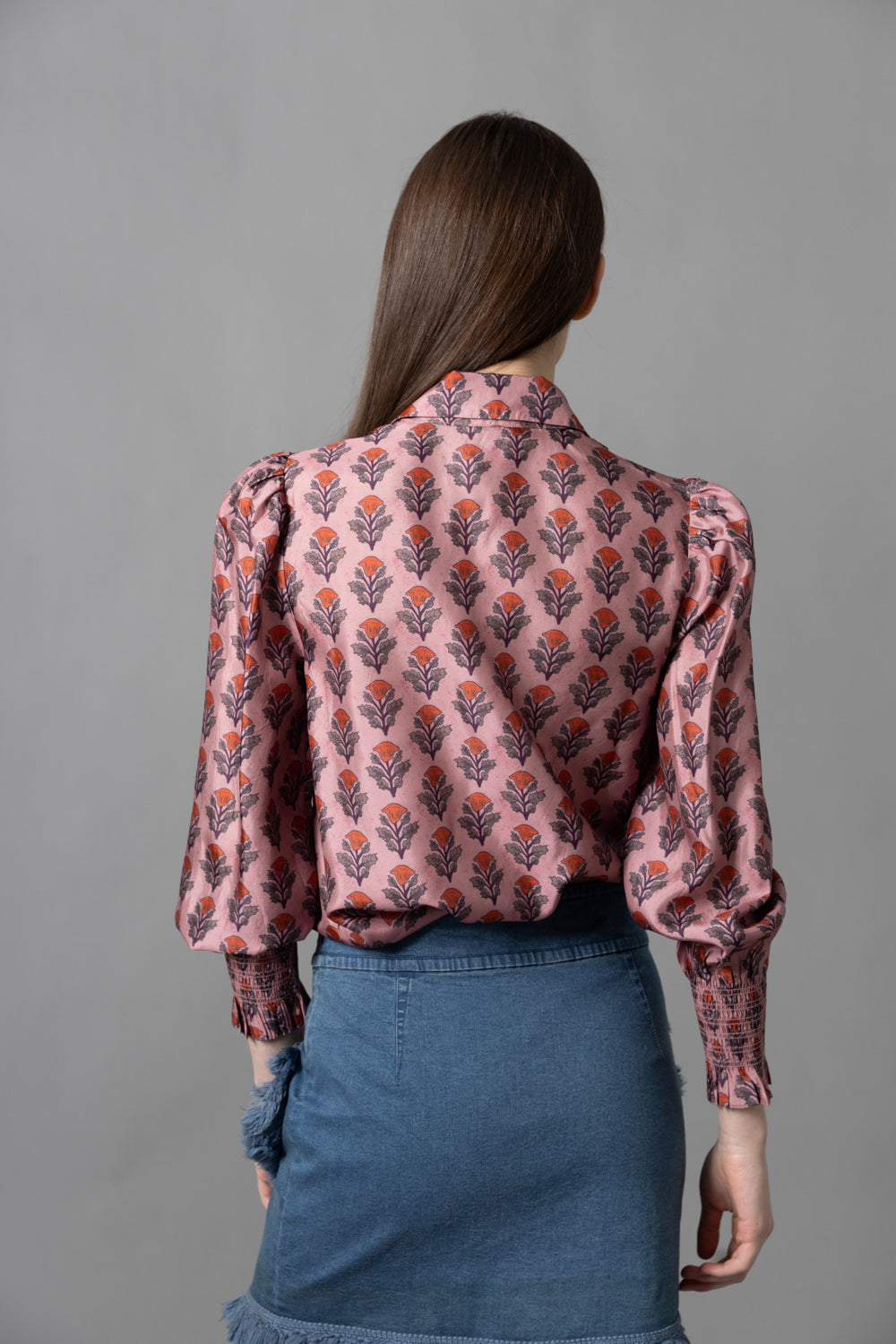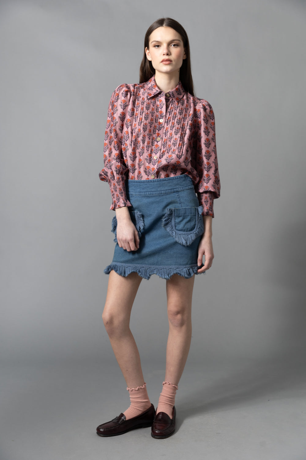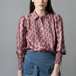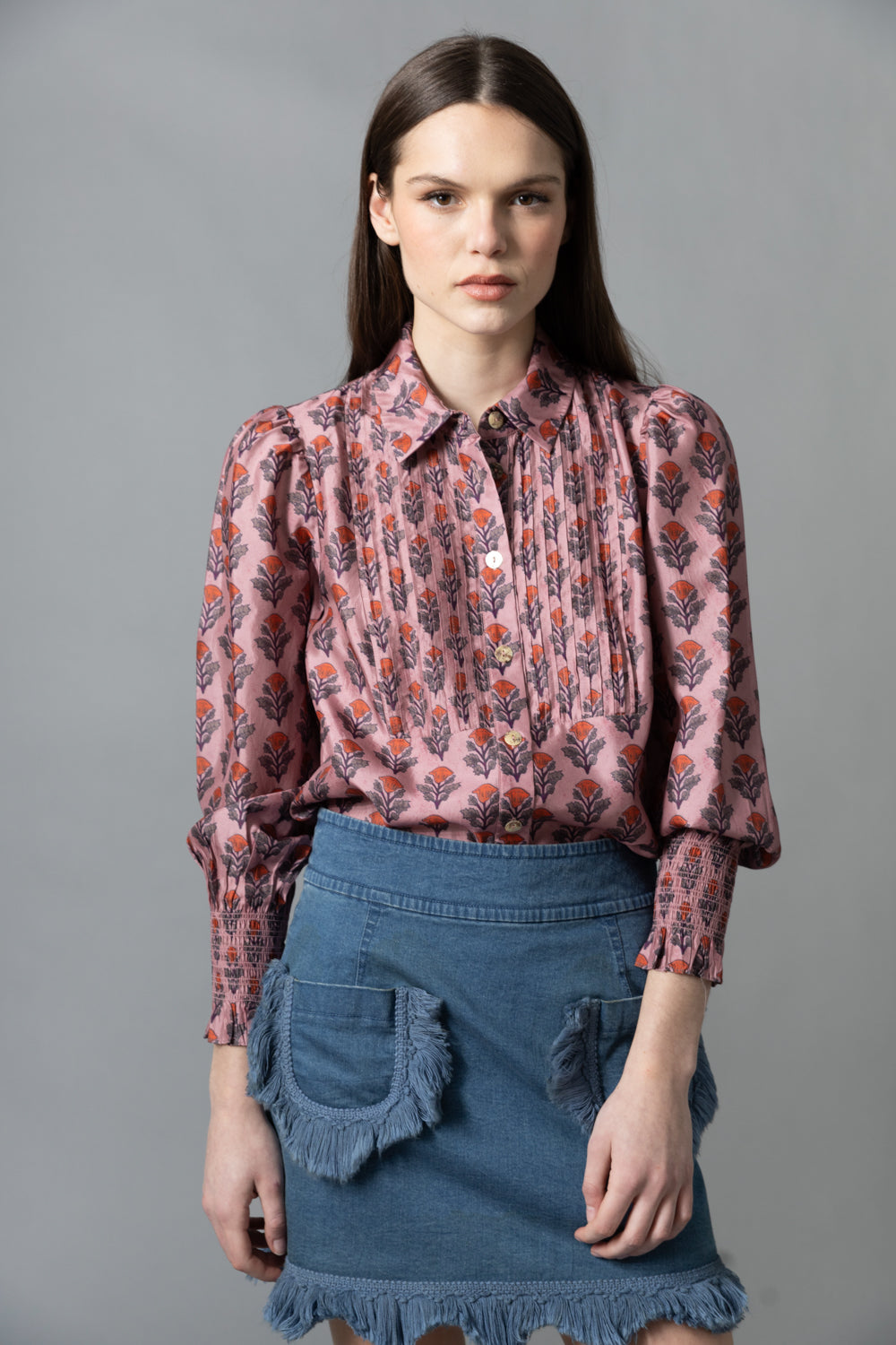• Button down shirt with a pleated bib and modestly puffed sleeves with smocking at wrists.