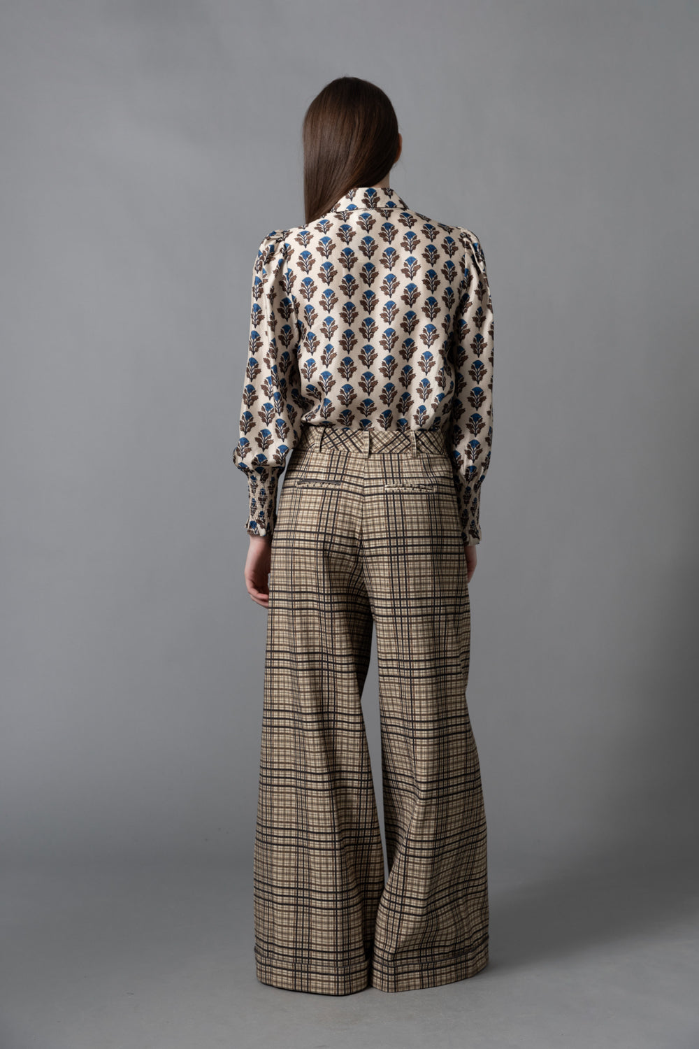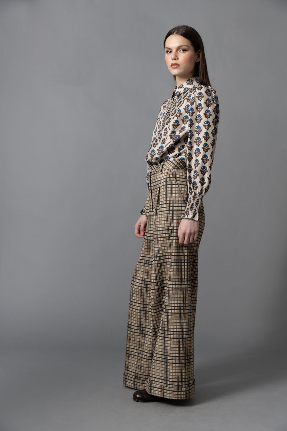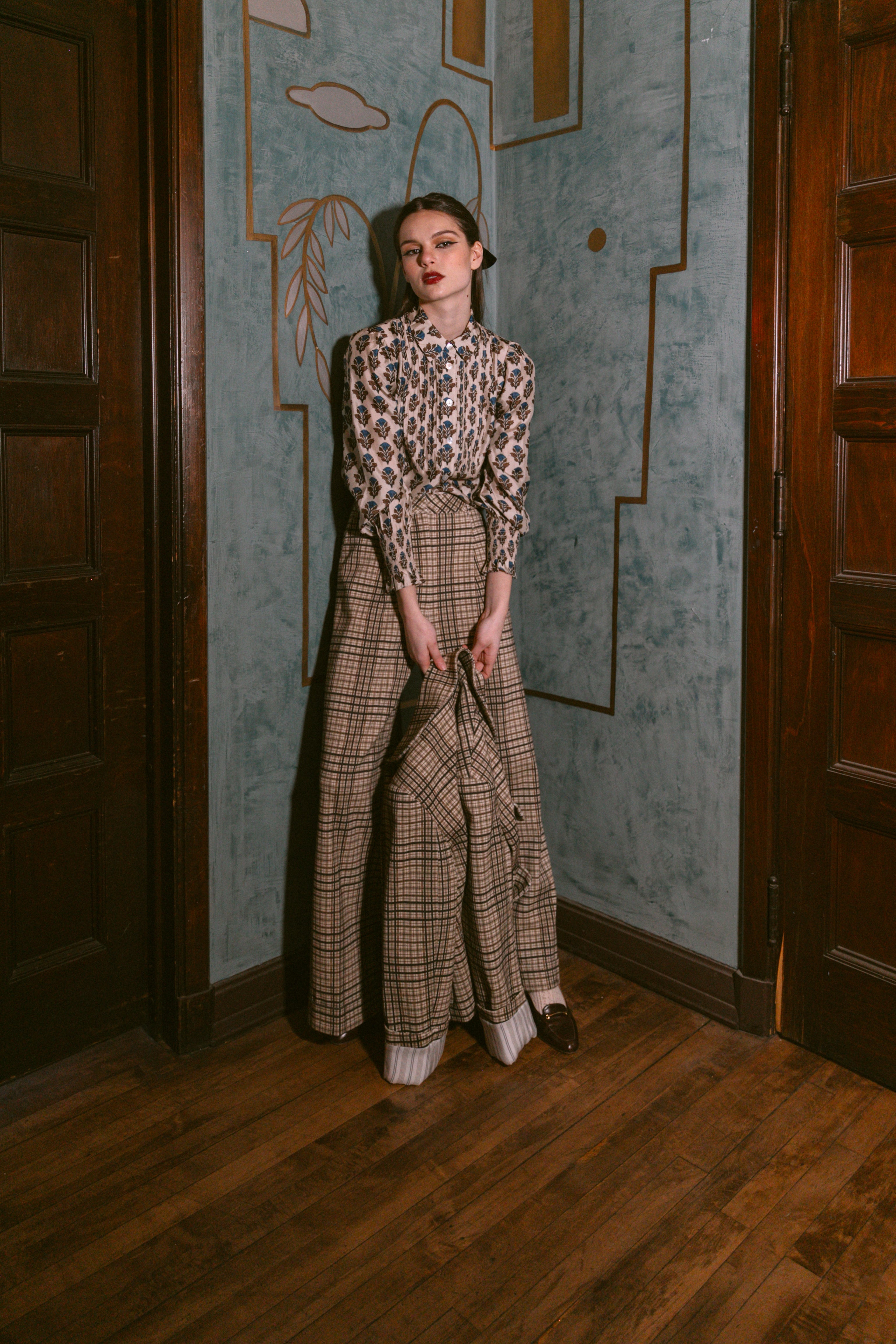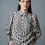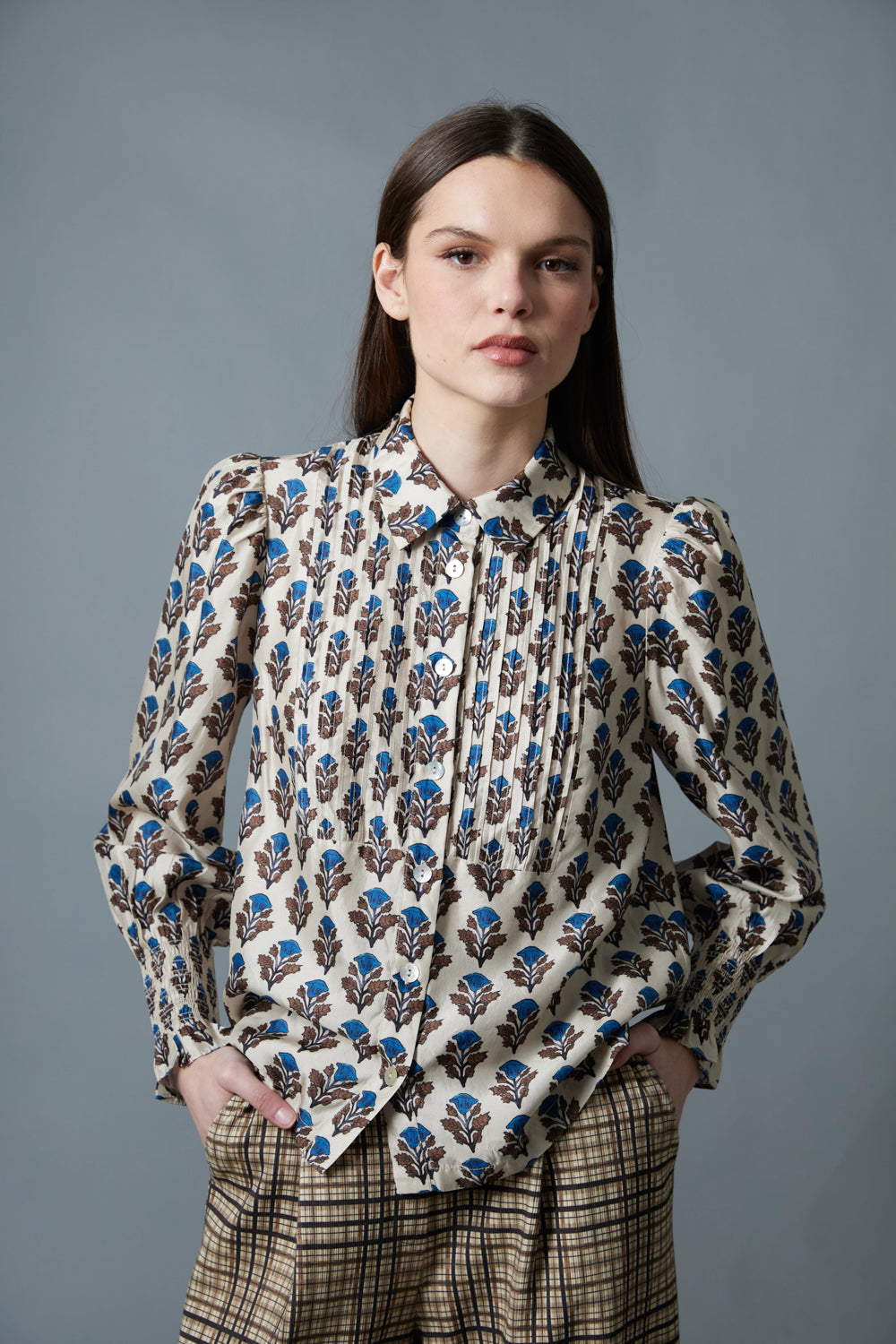 • Button down shirt with a pleated bib and modestly puffed sleeves with smocking at wrists.