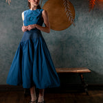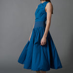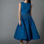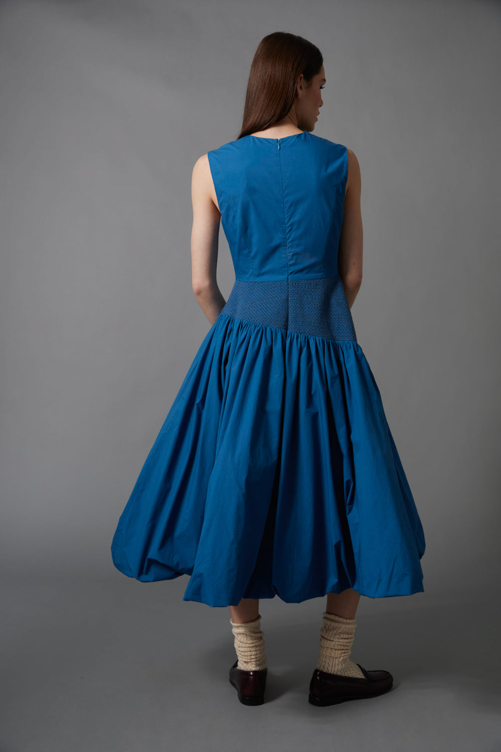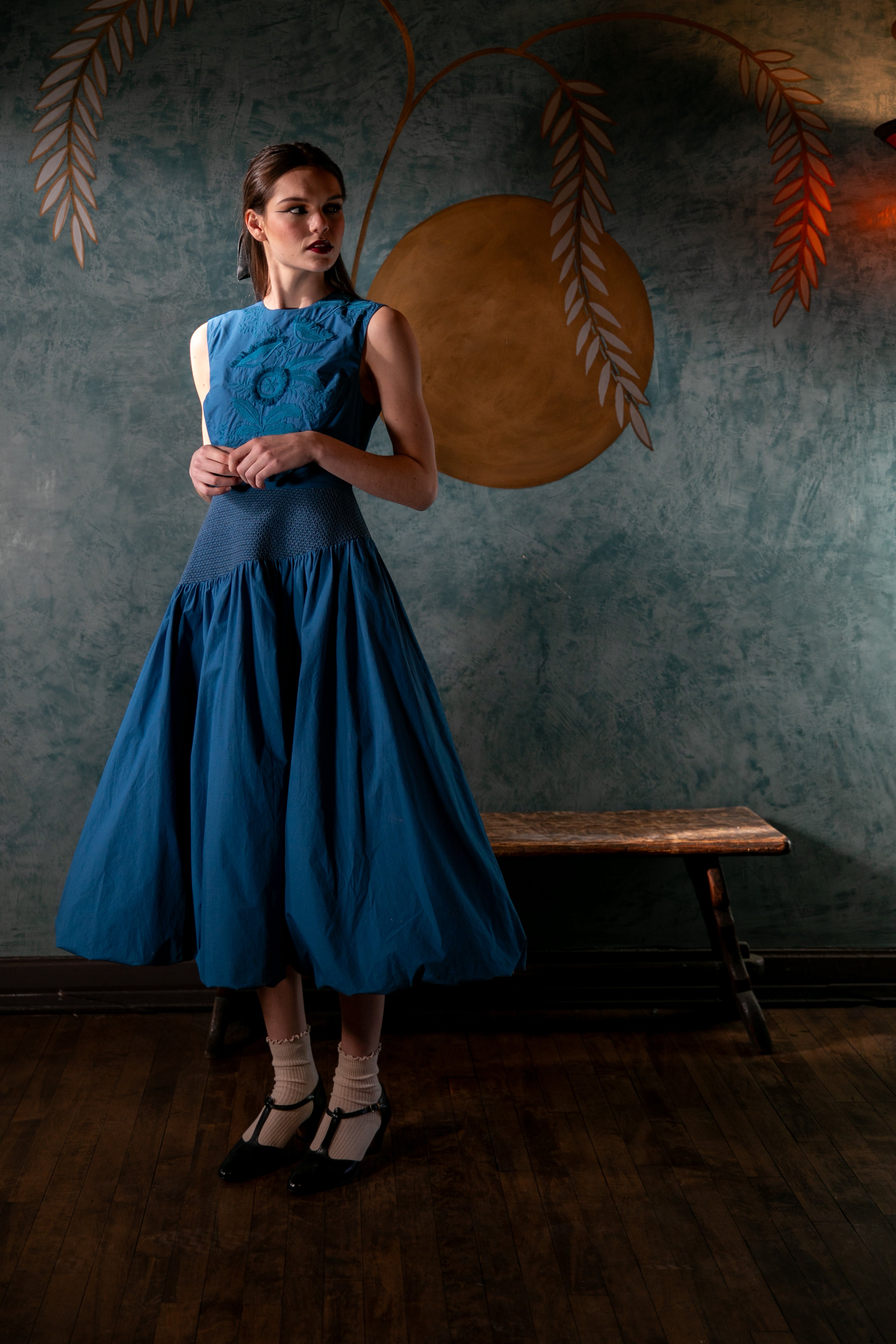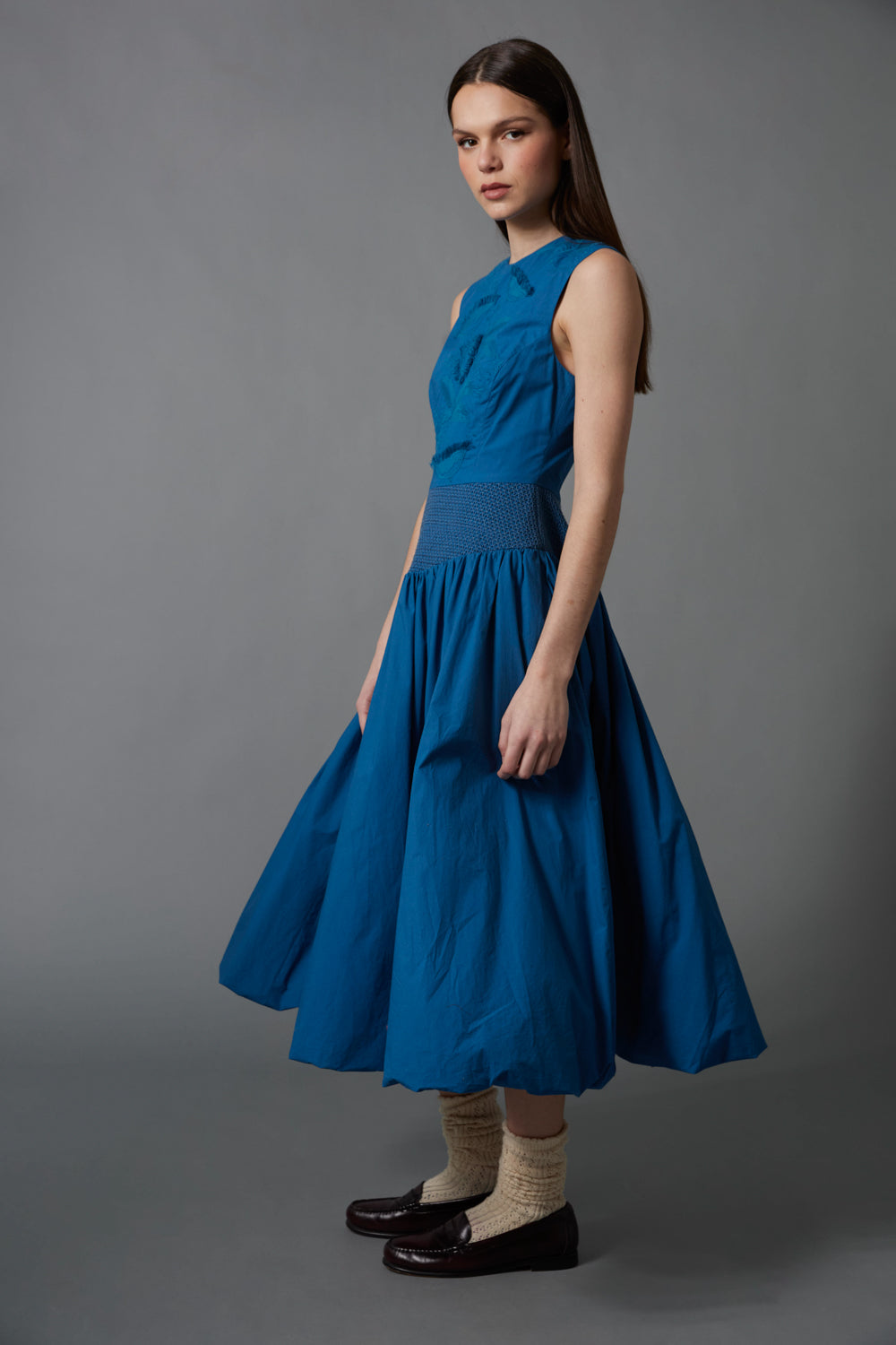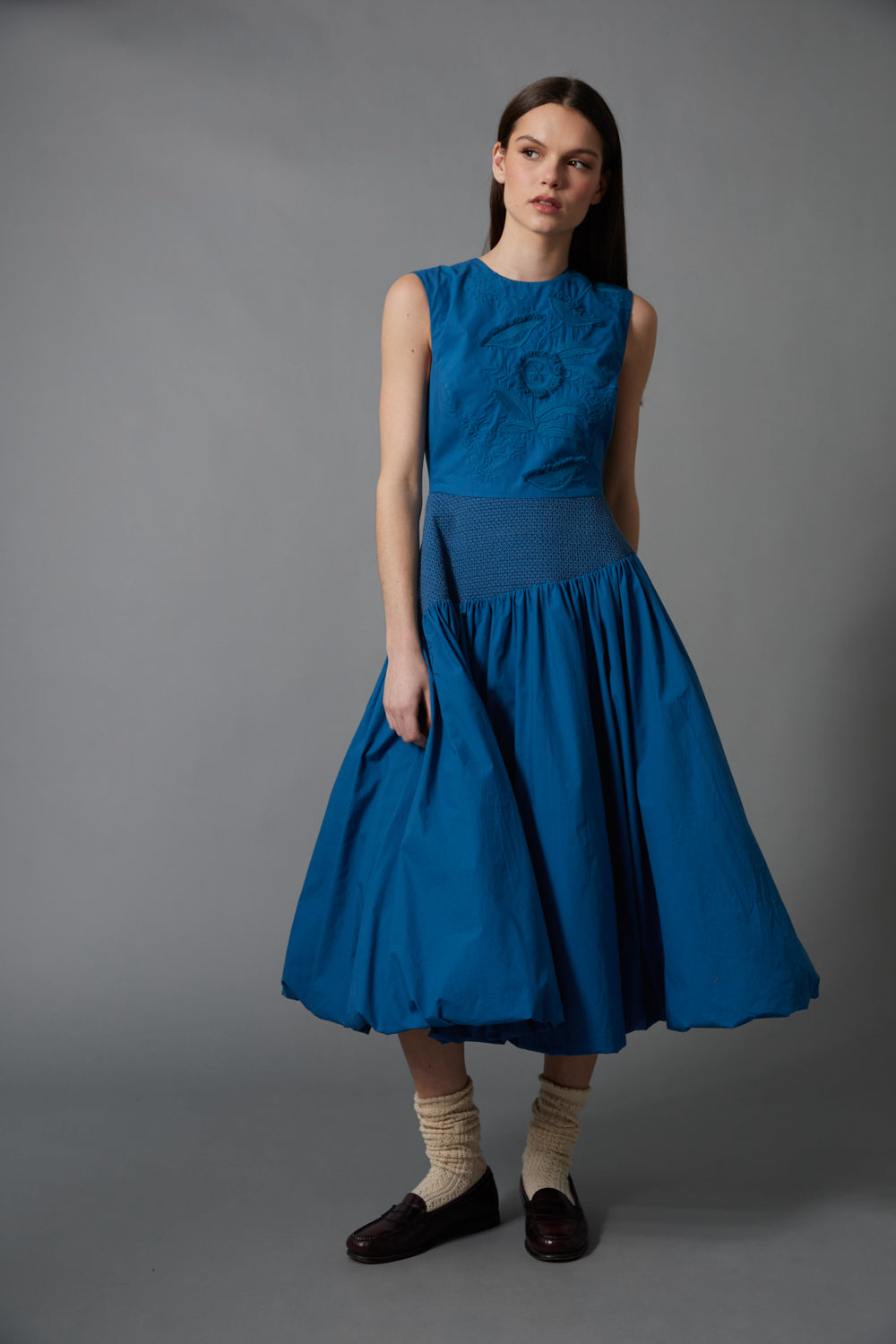 • Midi length dress has 3 dimensional tonal embroidery at the fitted bodice and smocking at the asymmetric hip yoke, side seam pockets and a bubble hemmed skirt.
