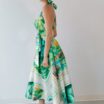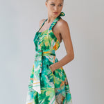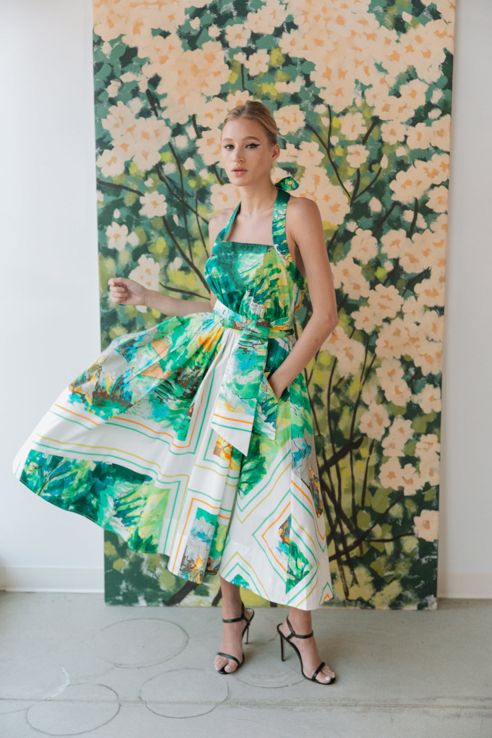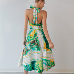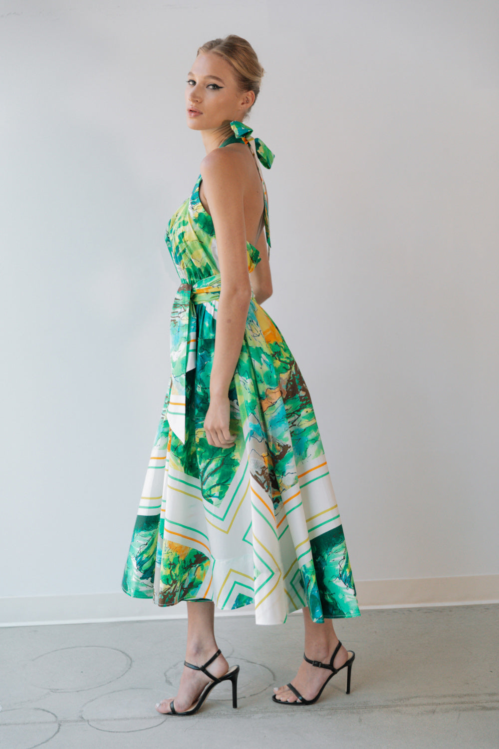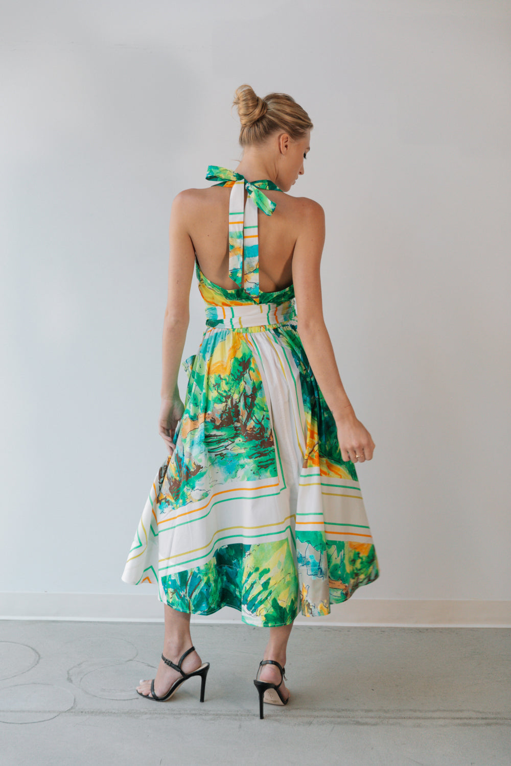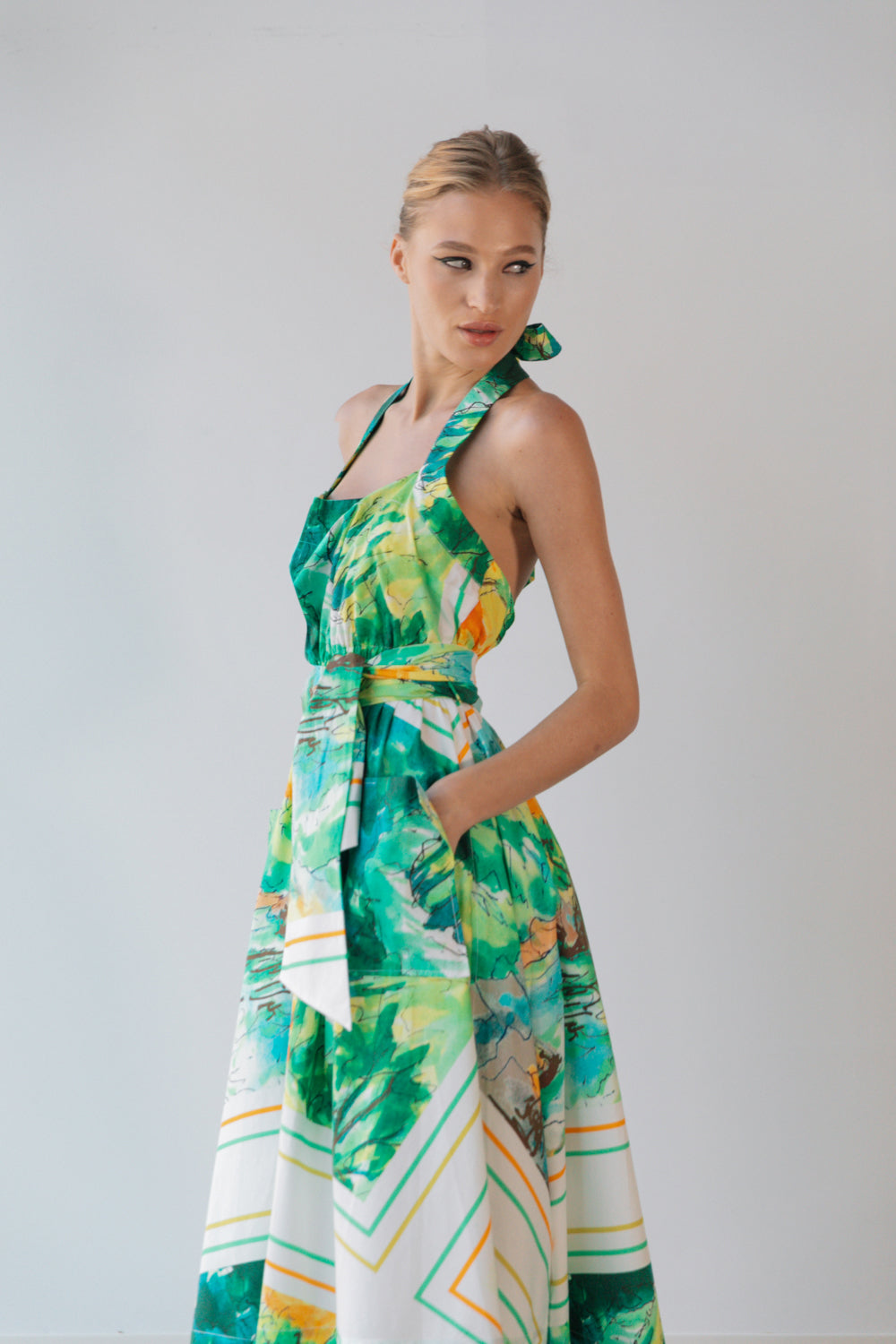 • Beautiful tie back halter midi dress in organic cotton poplin. Half circle skirt has an elasticated waist and coordinating belt for a cinched look.