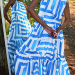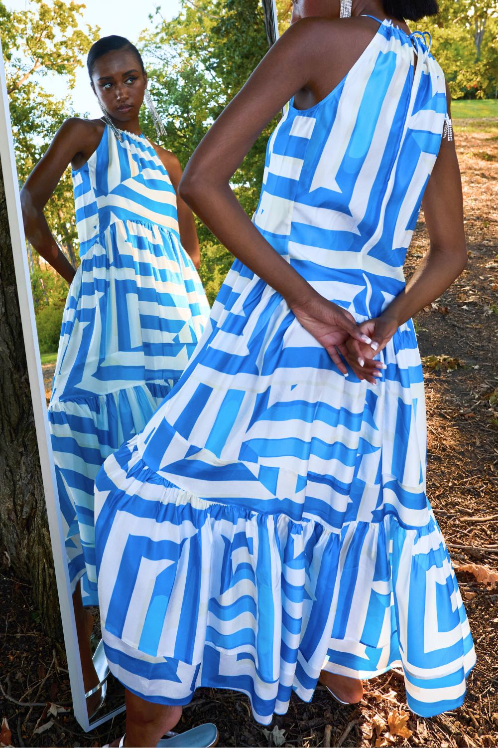 • Breezy halter neck dress has a high/low flounced skirt and rhinestone tasseled back neck ties. Custom border prints accentuate the hem and sides