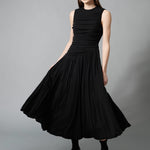 • Our sleeveless Jersey Overlay Frock has a jewel neck, shirred bodice, an asymmetric hip yoke, and a bubble skirt lined with cotton/spandex stretch poplin, and side seam pockets