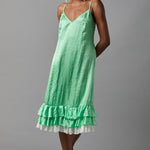 • Vintage slip style in drapey satin has a relaxed fit and both self satin and contrast cotton eyelet flounces at the hem.