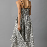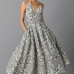 • Midi length slip dress with an elasticated fitted waist and full gathered skirt in beautifully hand-embroidered linen. The dress features adjustable tie-back spaghetti straps and side seam pockets.