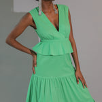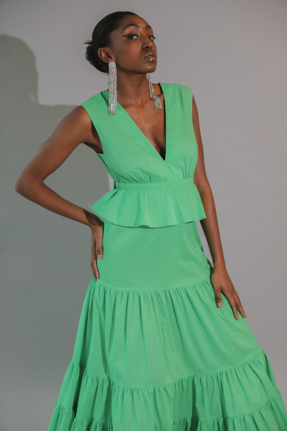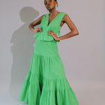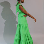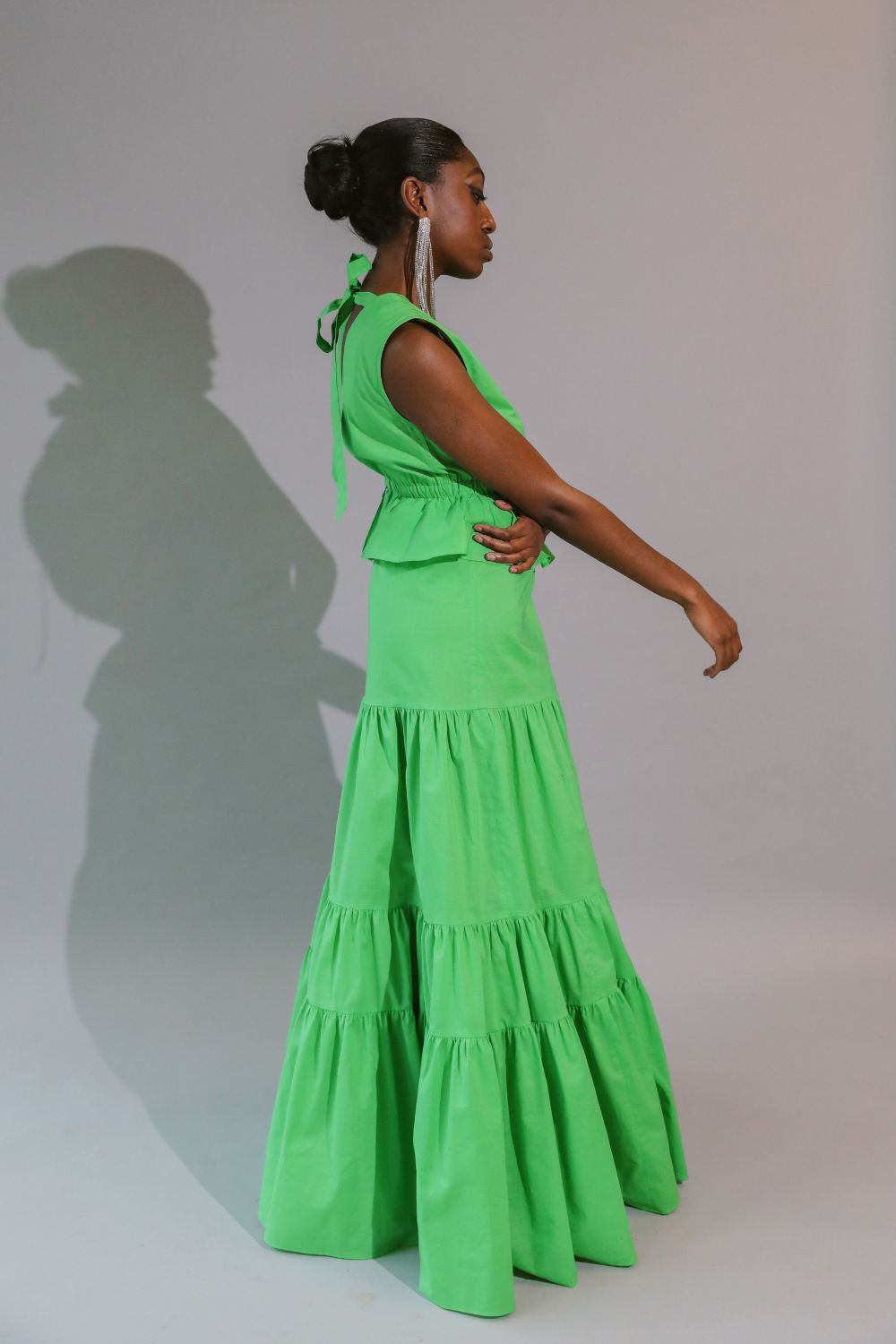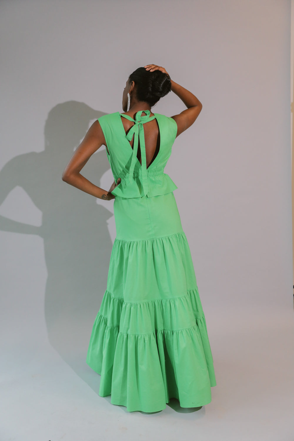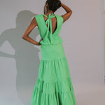 • Tiered maxi dress with fitted bodice and floor length skirt has side seam pockets and back neck ties. A modesty panel at front bodice gives the wearer the option of more or less coverage.