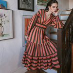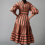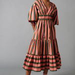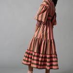• Shirred bodice dress has tasseled drawstring ties at the front chest, elasticated waist and a full, tiered skirt. Frilled sleeves add drama! Side seam pockets.