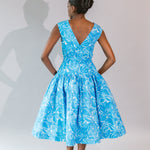• Our midi length, V-neck fit & flare dress has tucks at the waist that release under the bust. The full skirt has side seam pockets and a petticoat lining