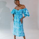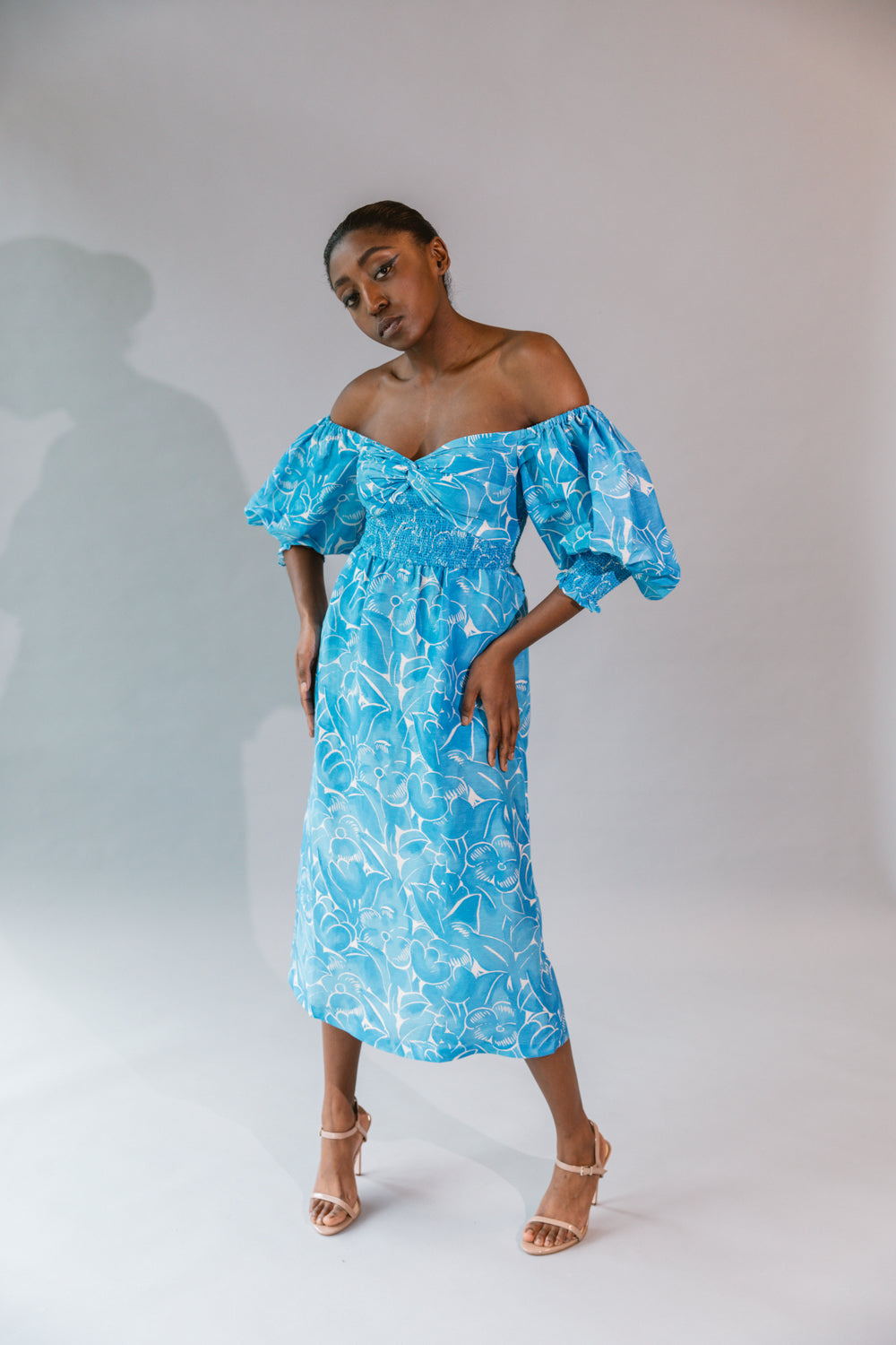 • Printed organic cotton, off shoulder, full sleeved dress has sweetheart neckline and twist detail at bodice. Smocking at waist, back bodice, and sleeve cuffs. Side seam pockets. The skirt has a 14” slit at center back.
