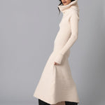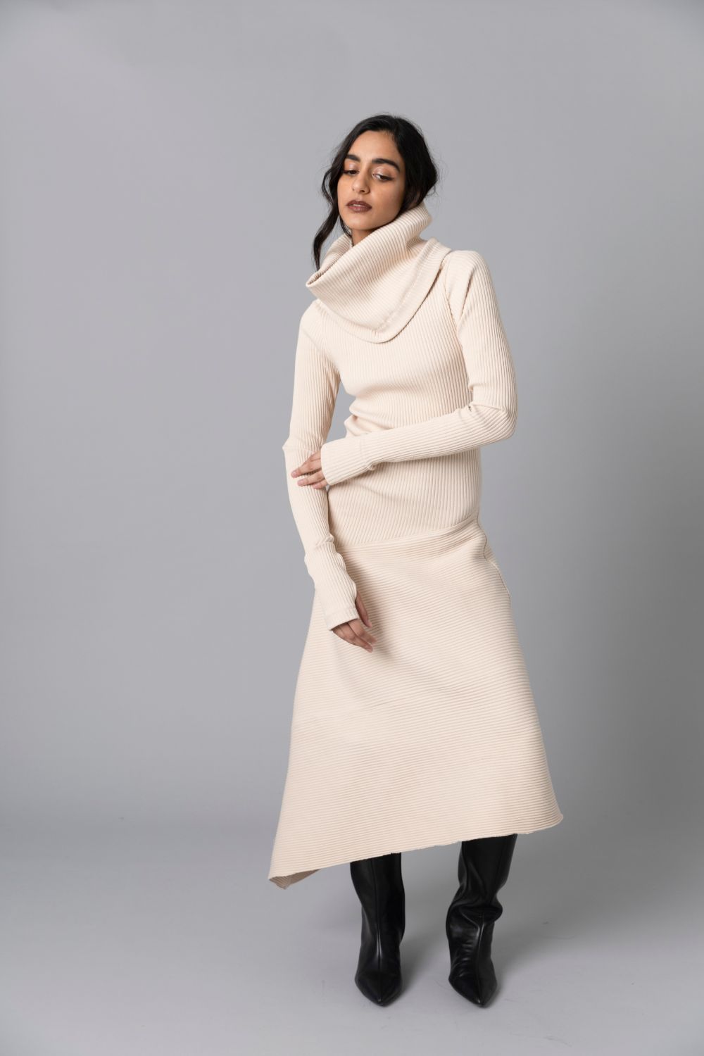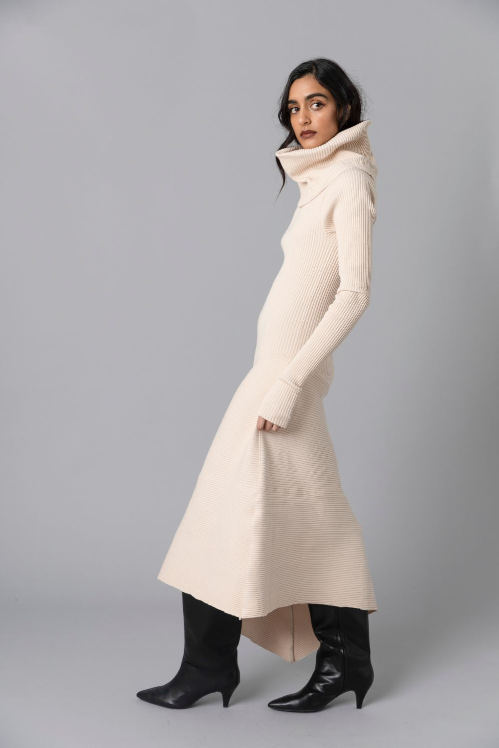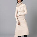 • Long sleeved dress has dramatic cowl collar and asymmetric skirt
