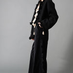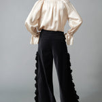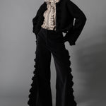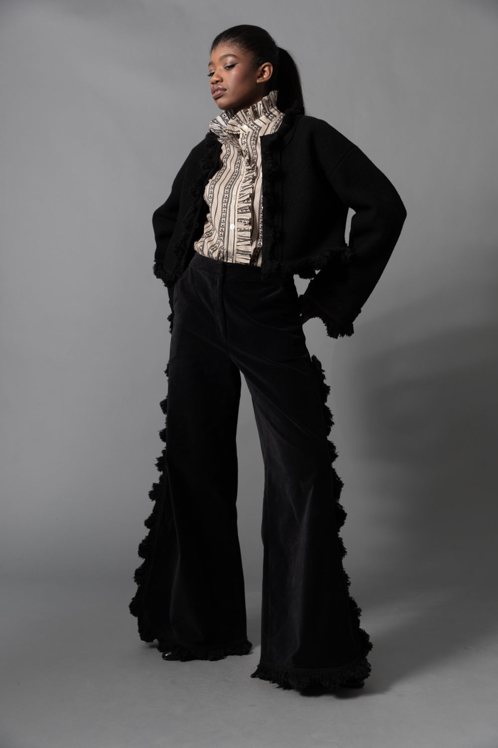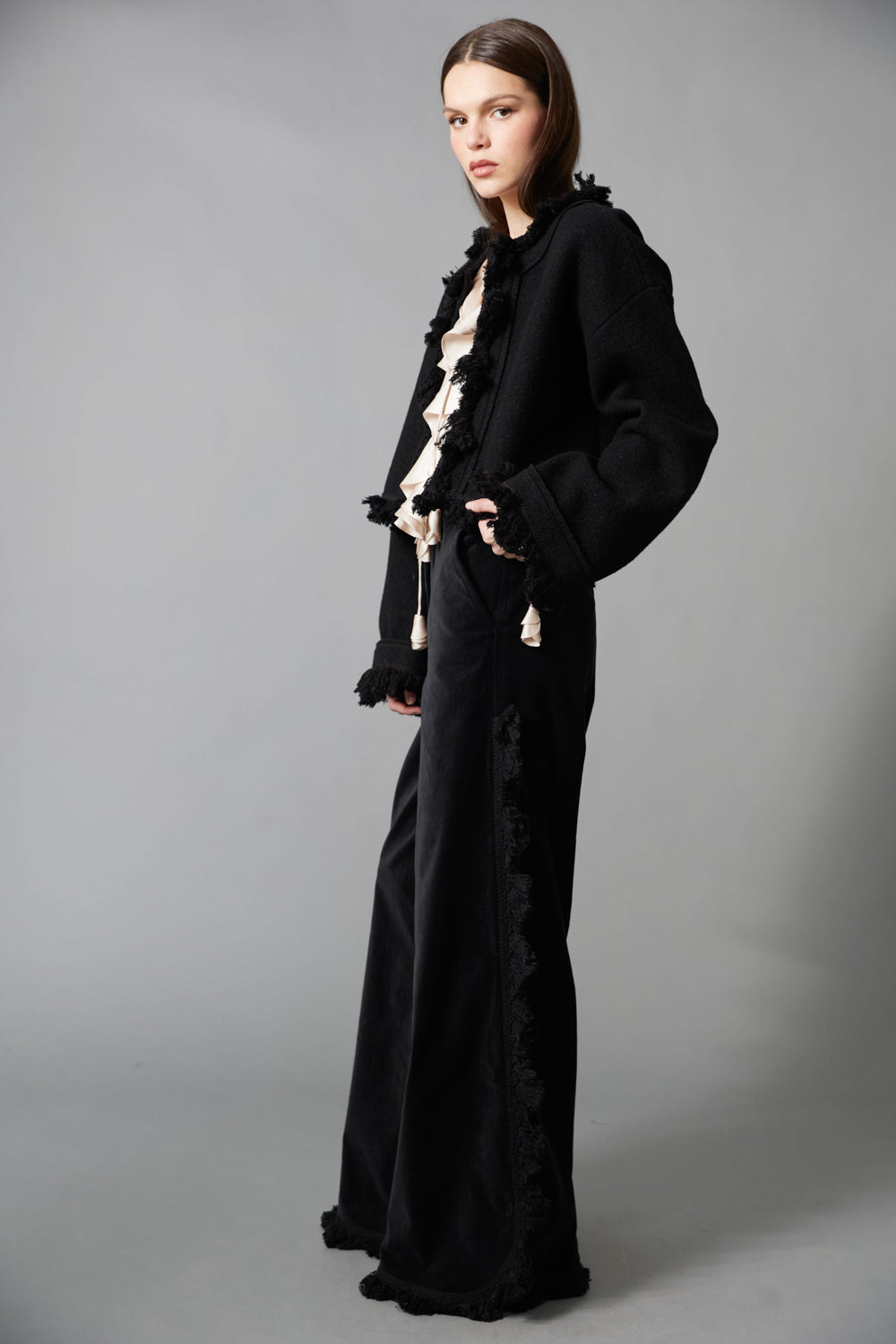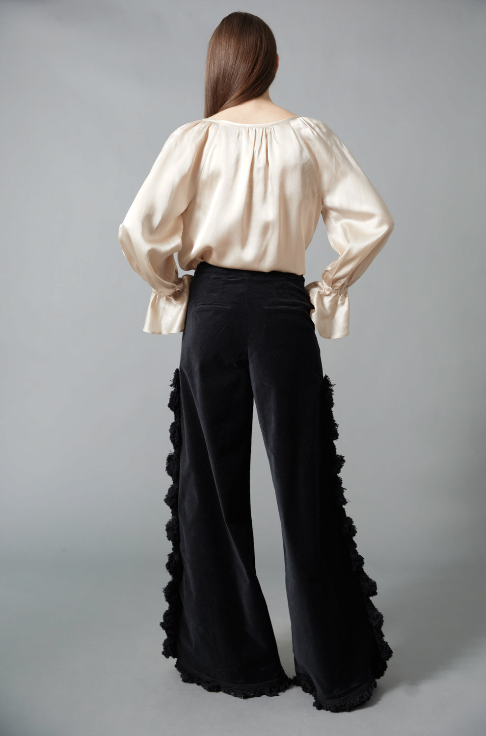 • Relaxed fit Velvet pants decorated with scalloped cotton fringe at sides and sweep. Off seam pockets at front.