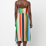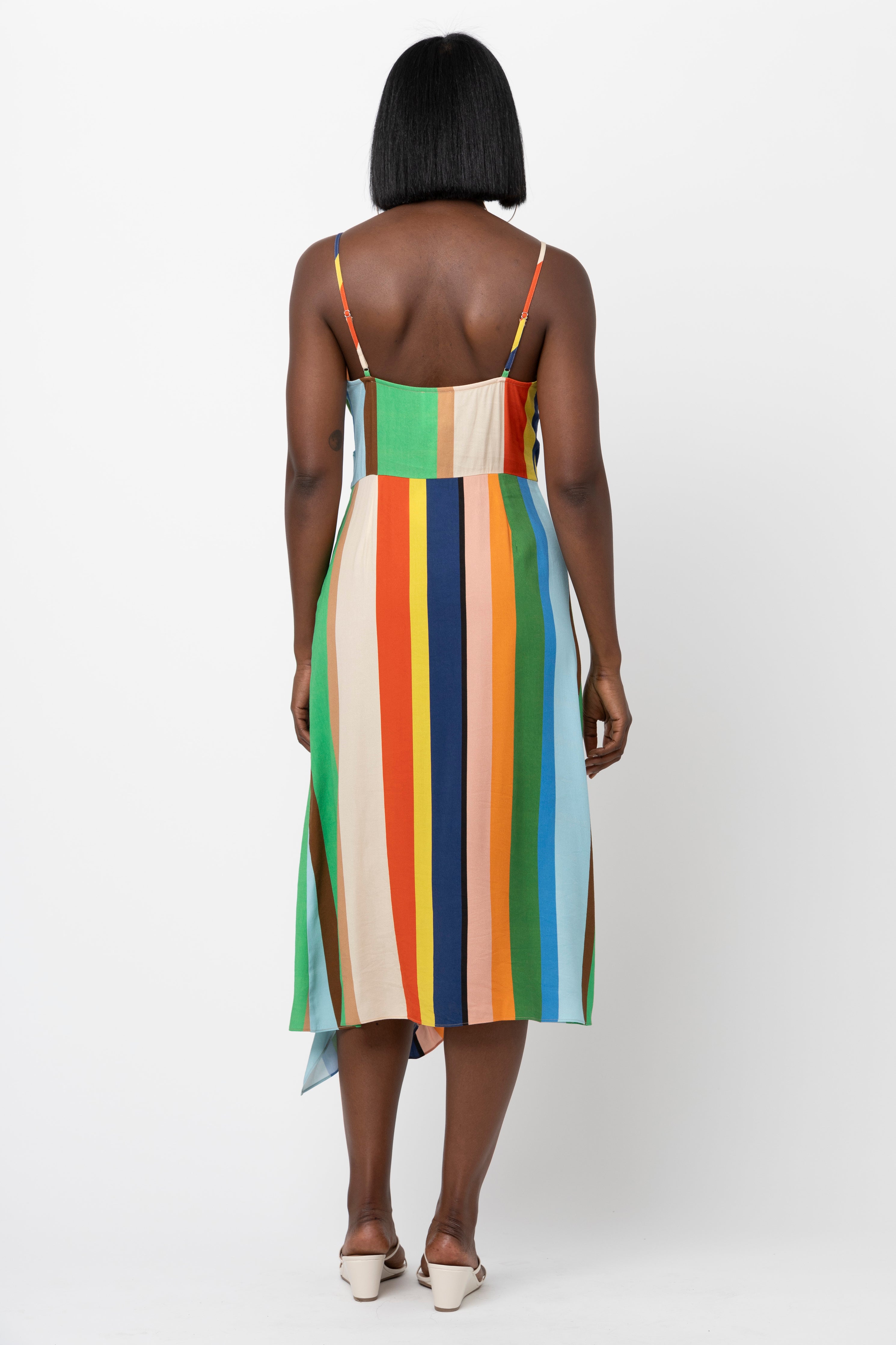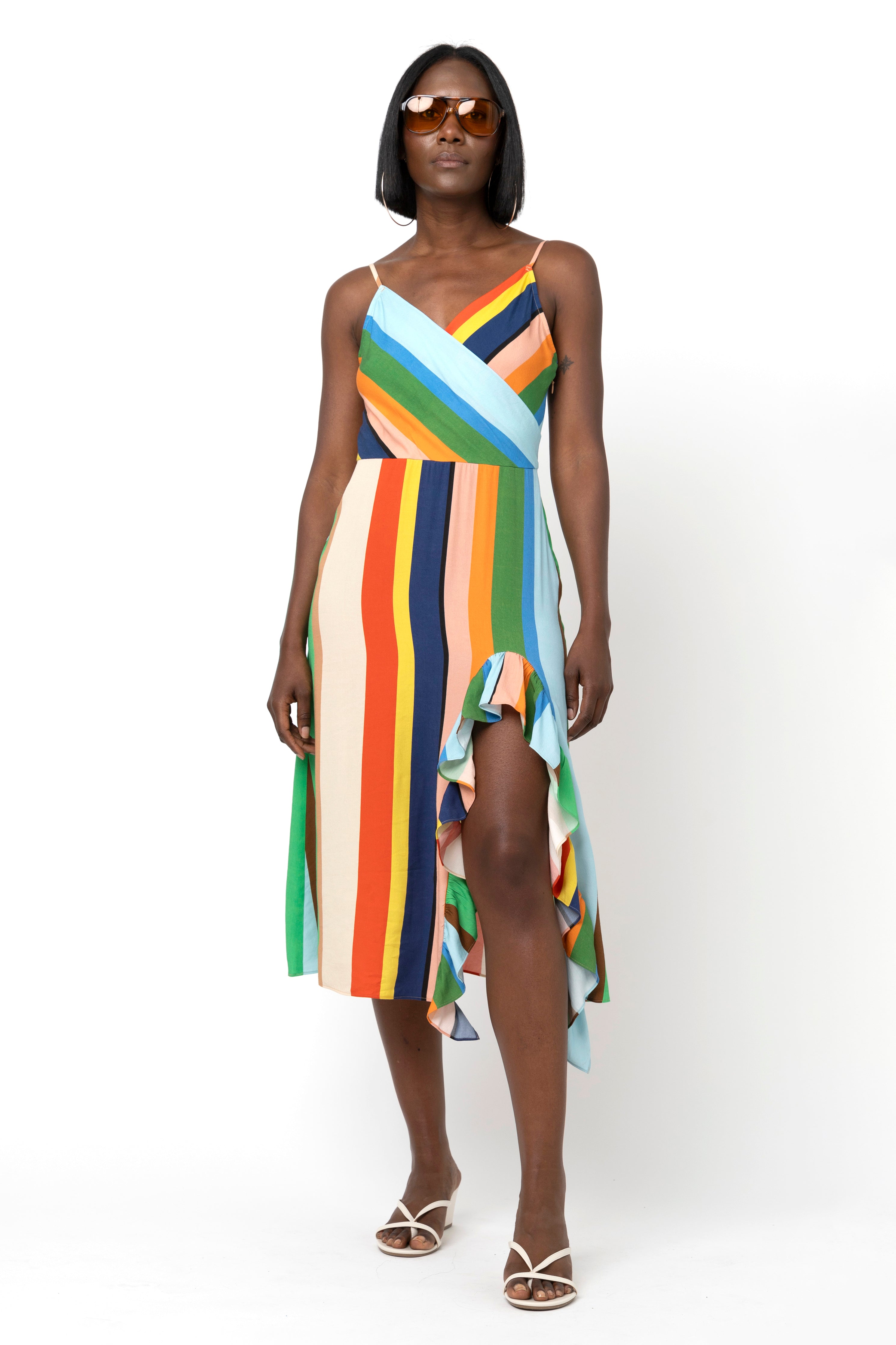 • Surplice slip dress with flounced slit at wearer’s left.