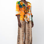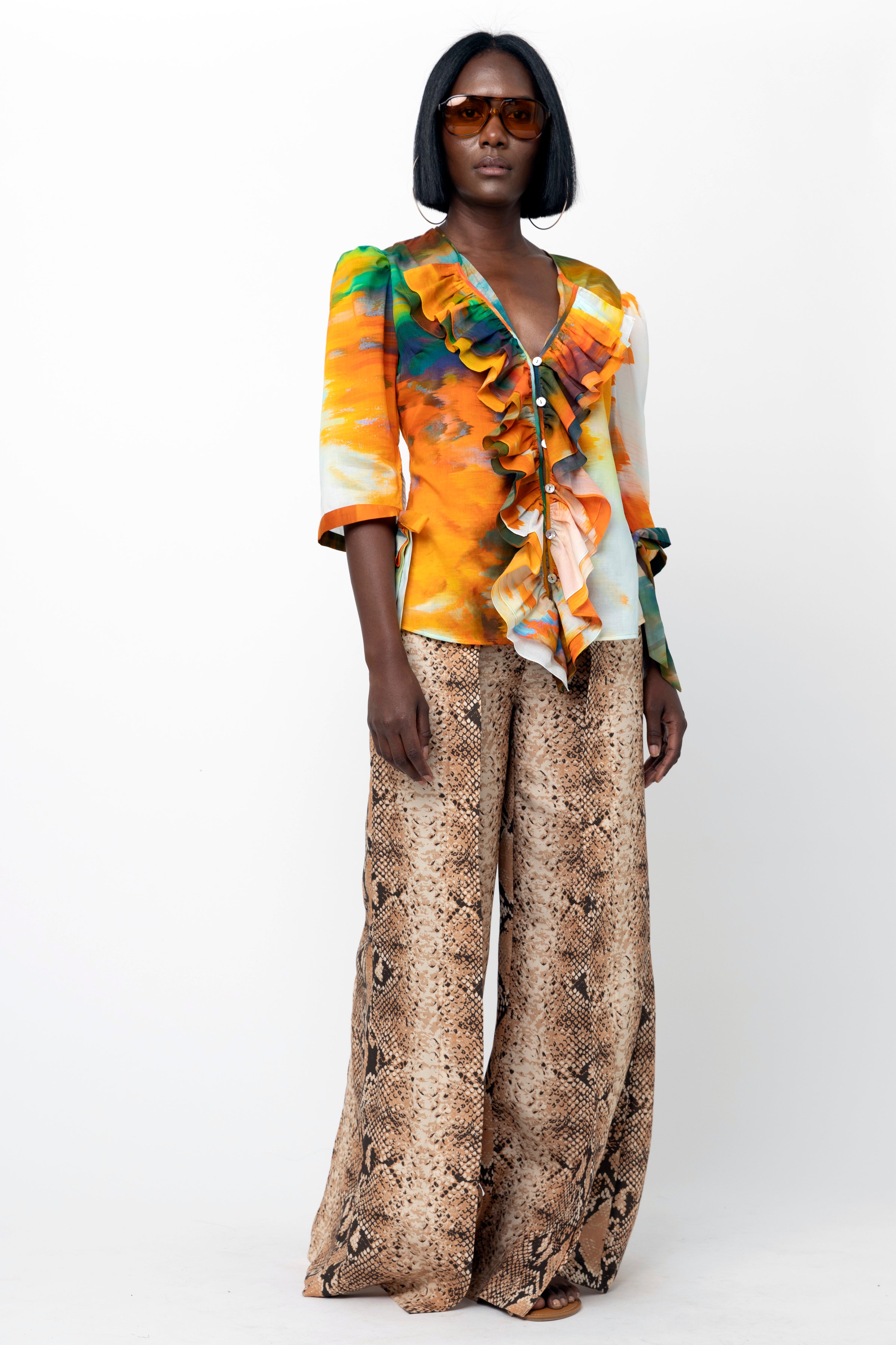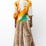 • Wide leg pant with front leg slits and flange detail at front and back princess seams.