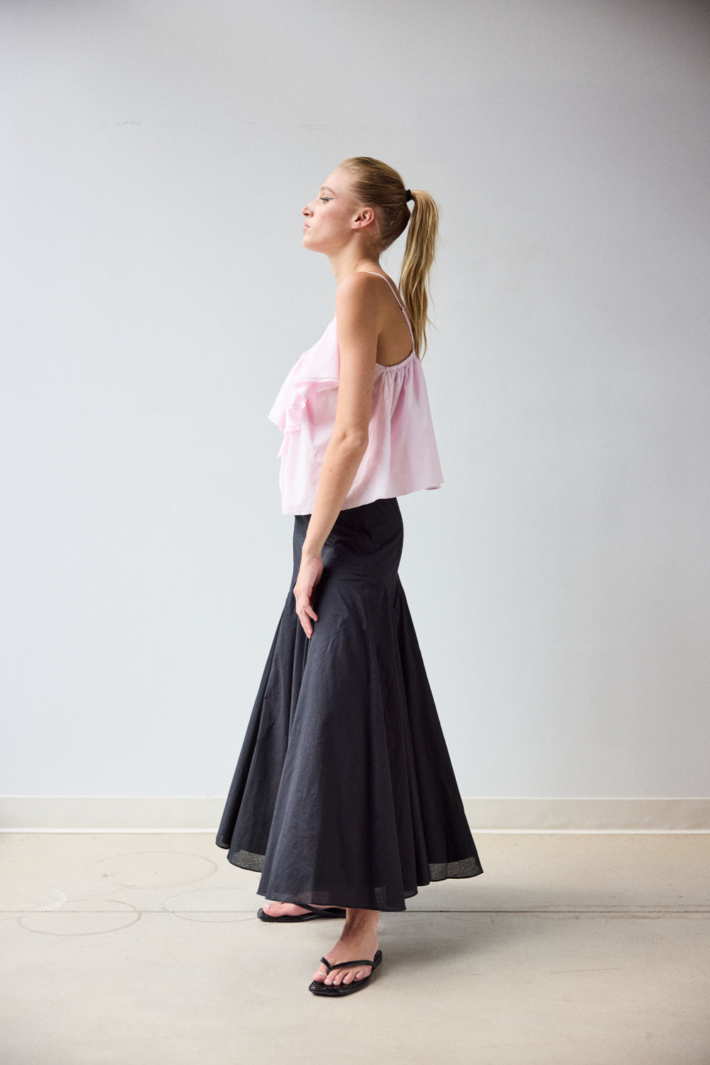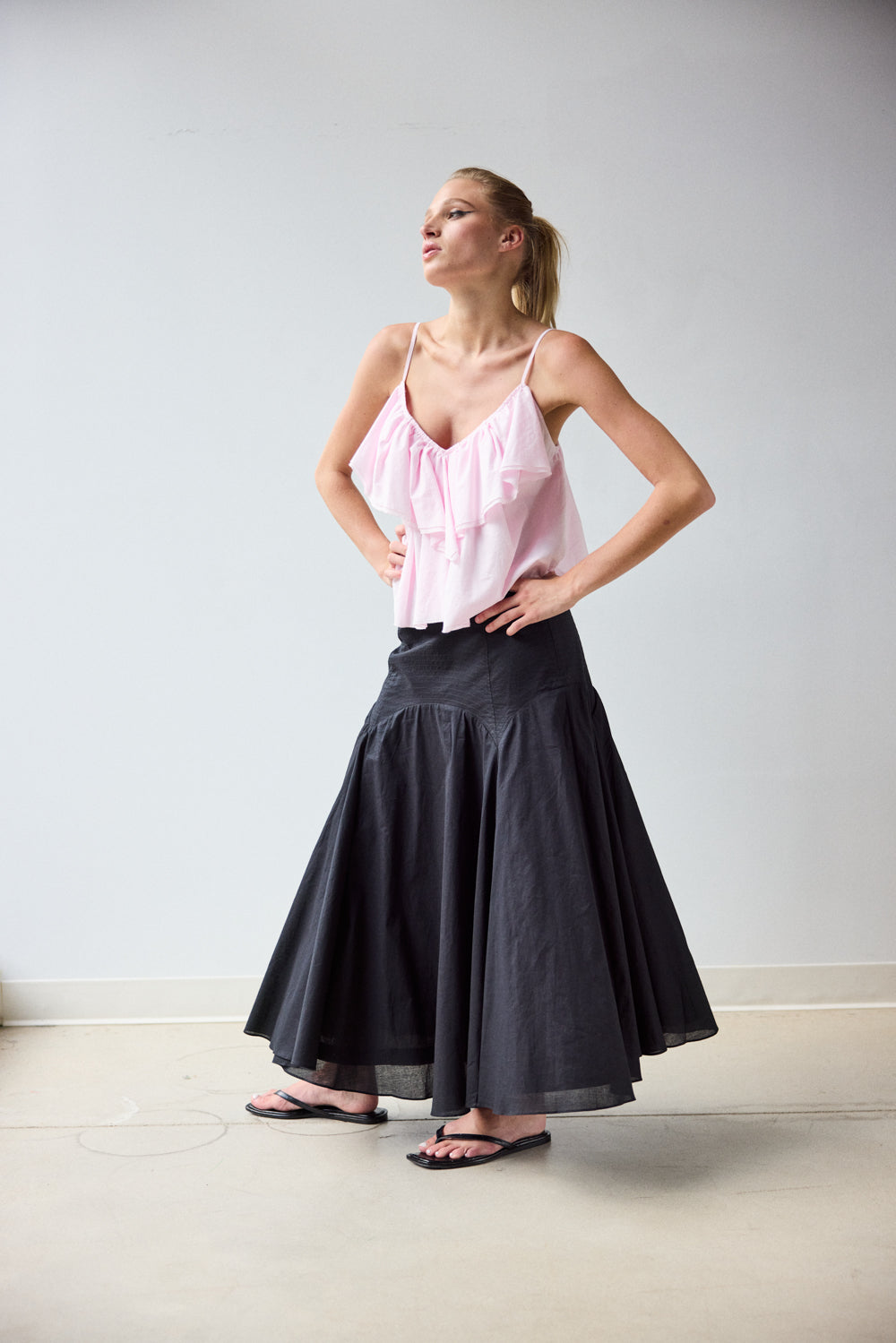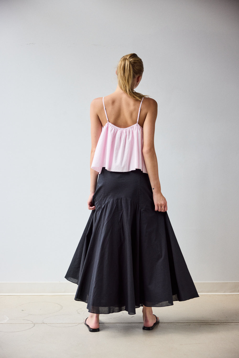 • Circle skirt in double layered Organic Cotton Lawn, with Trapunto and top stitch detailing at curved yoke.
