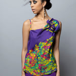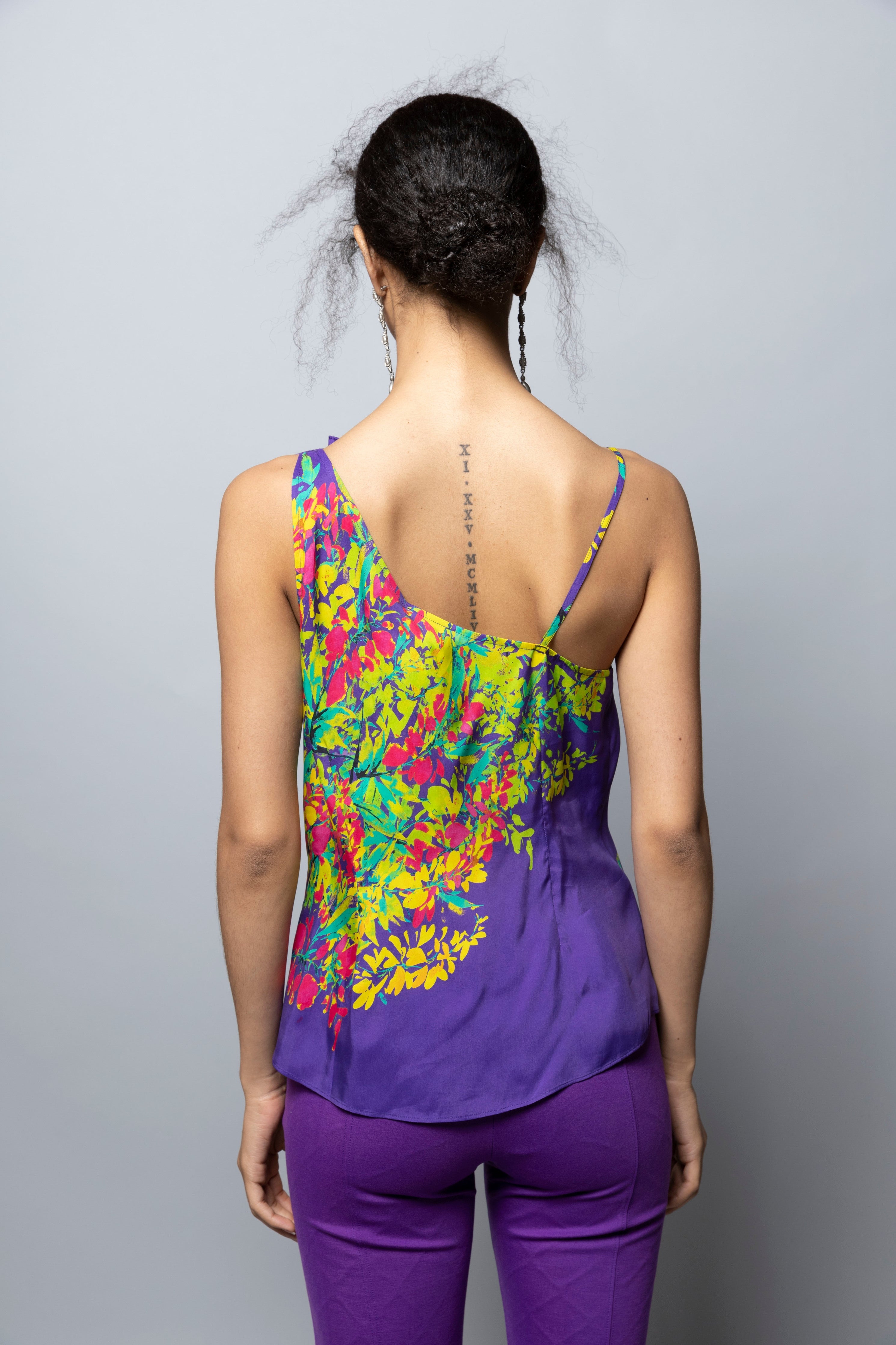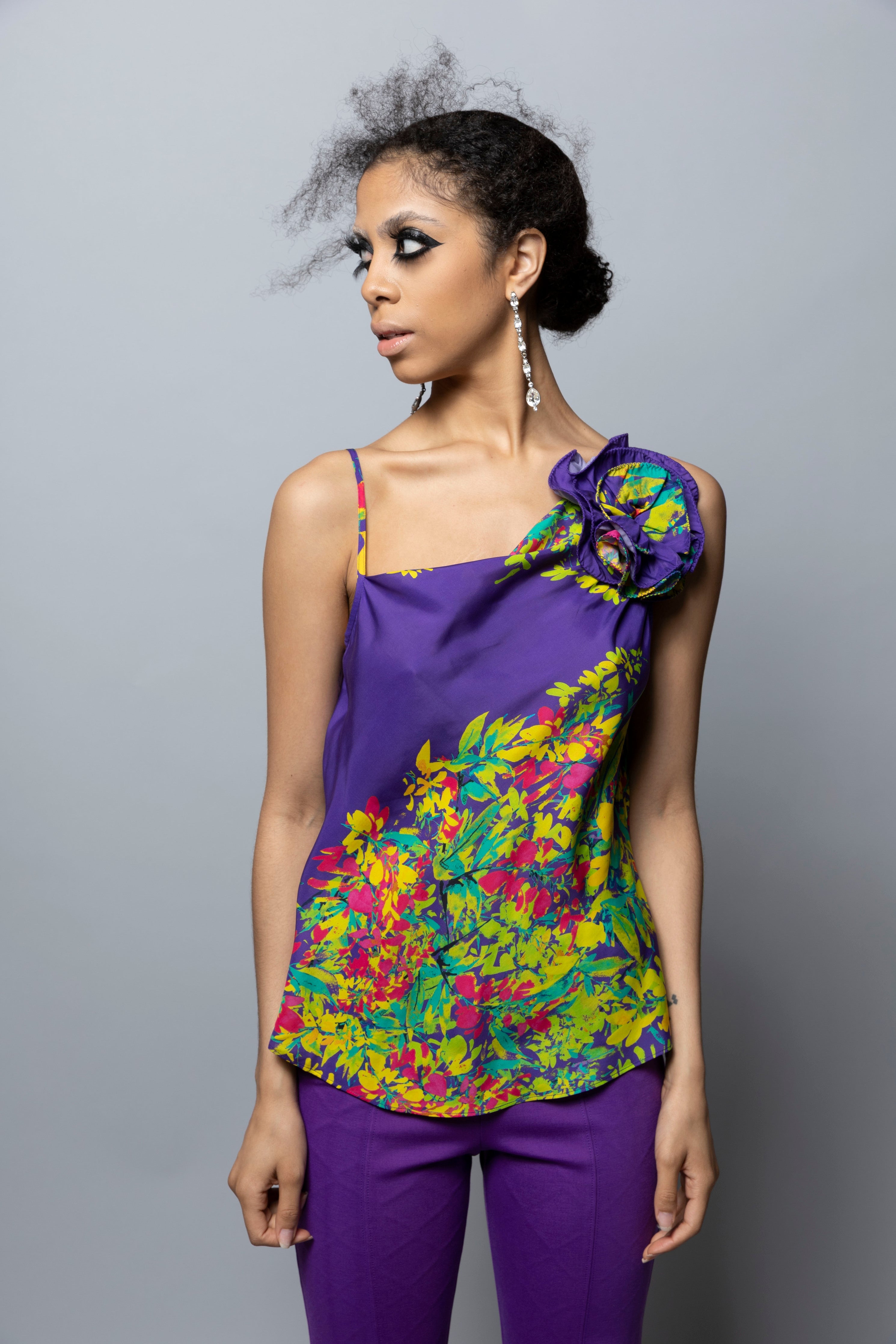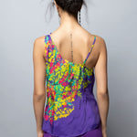 Printed cupro bias cut cami with asymmetric cowl neckline. Self fabric flower corsage at wearer's left neck. Cami measures 24 ½” from HPS. Corsage measures 5” in diameter.