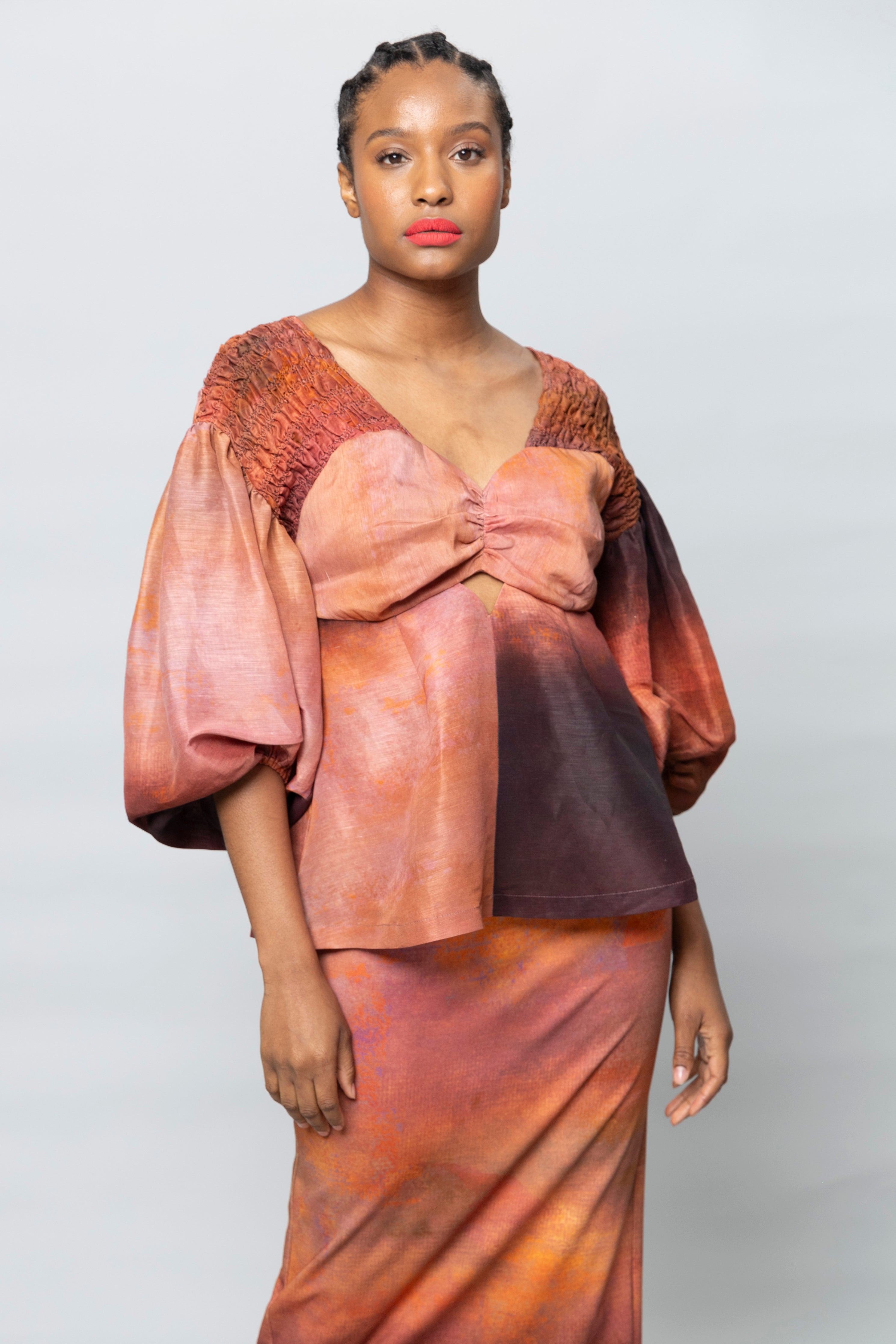 • Puff sleeve blouse with smocked front yoke and back bodice panels. Small peekaboo cutout at empire waist.