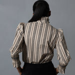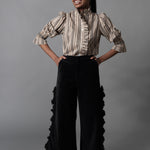 • Button down shirt with frill detailing at the collar continuing down the front placket, has modestly puffed sleeves with smocking at cuffs and Akoya shell buttons at front placket.