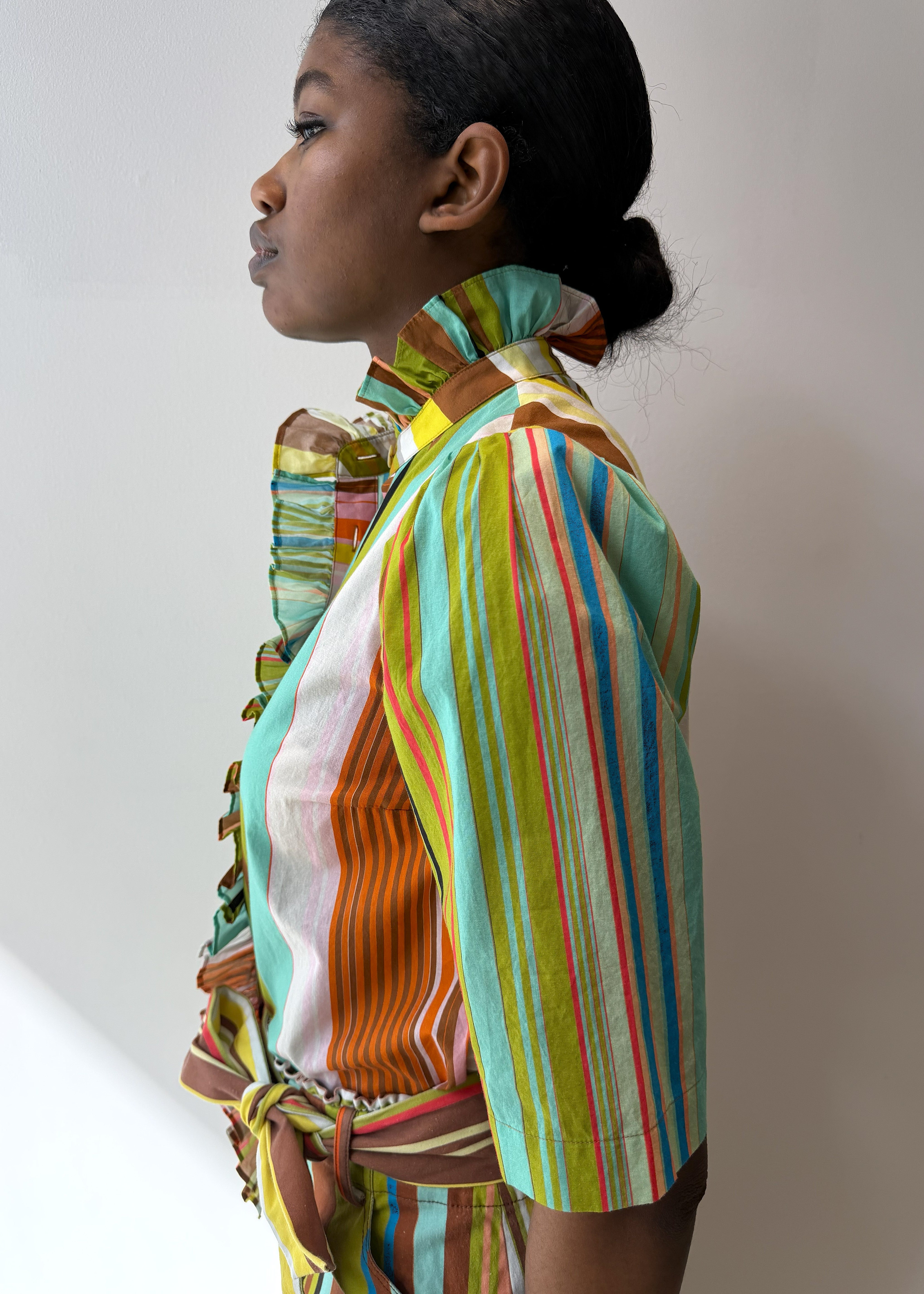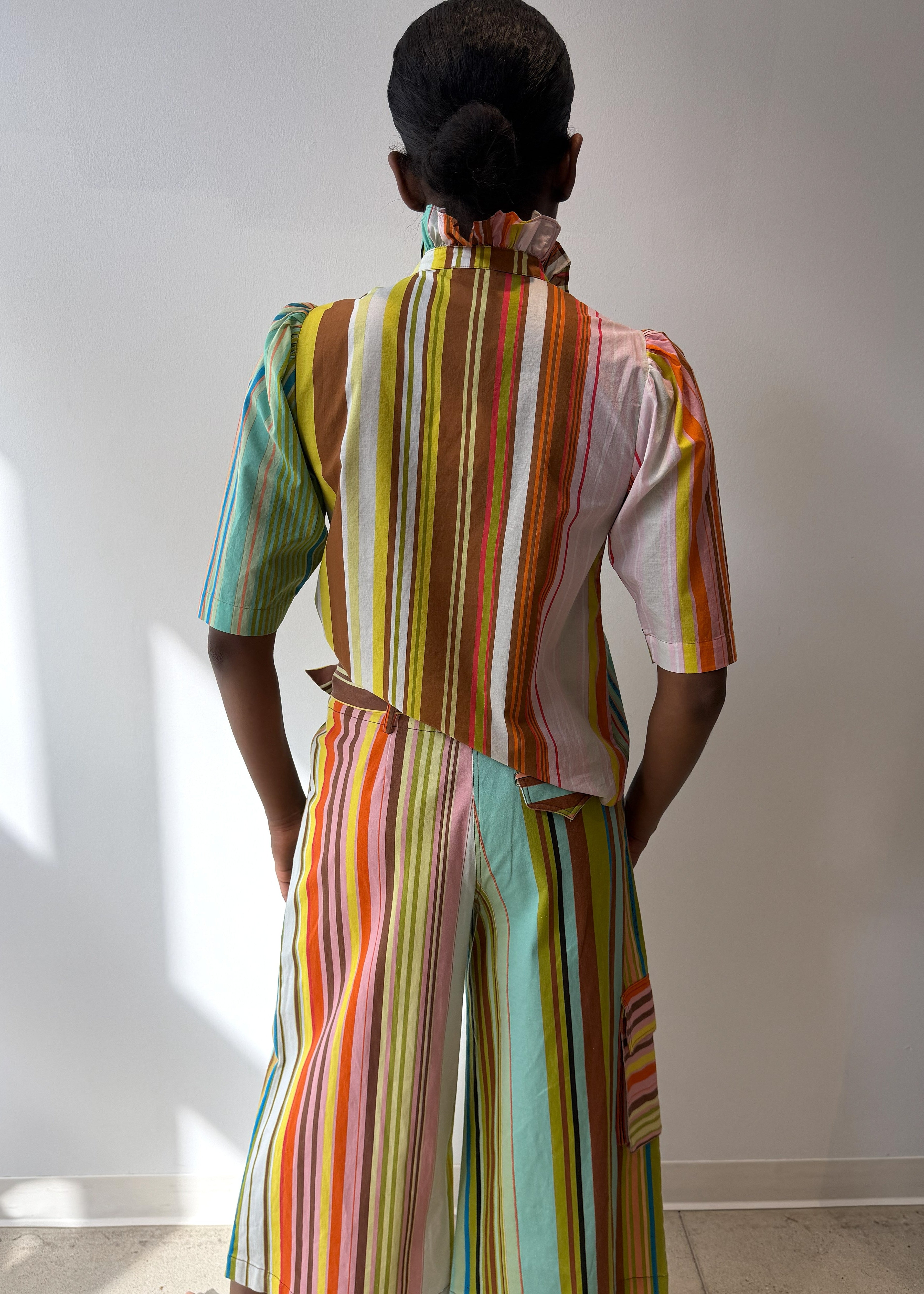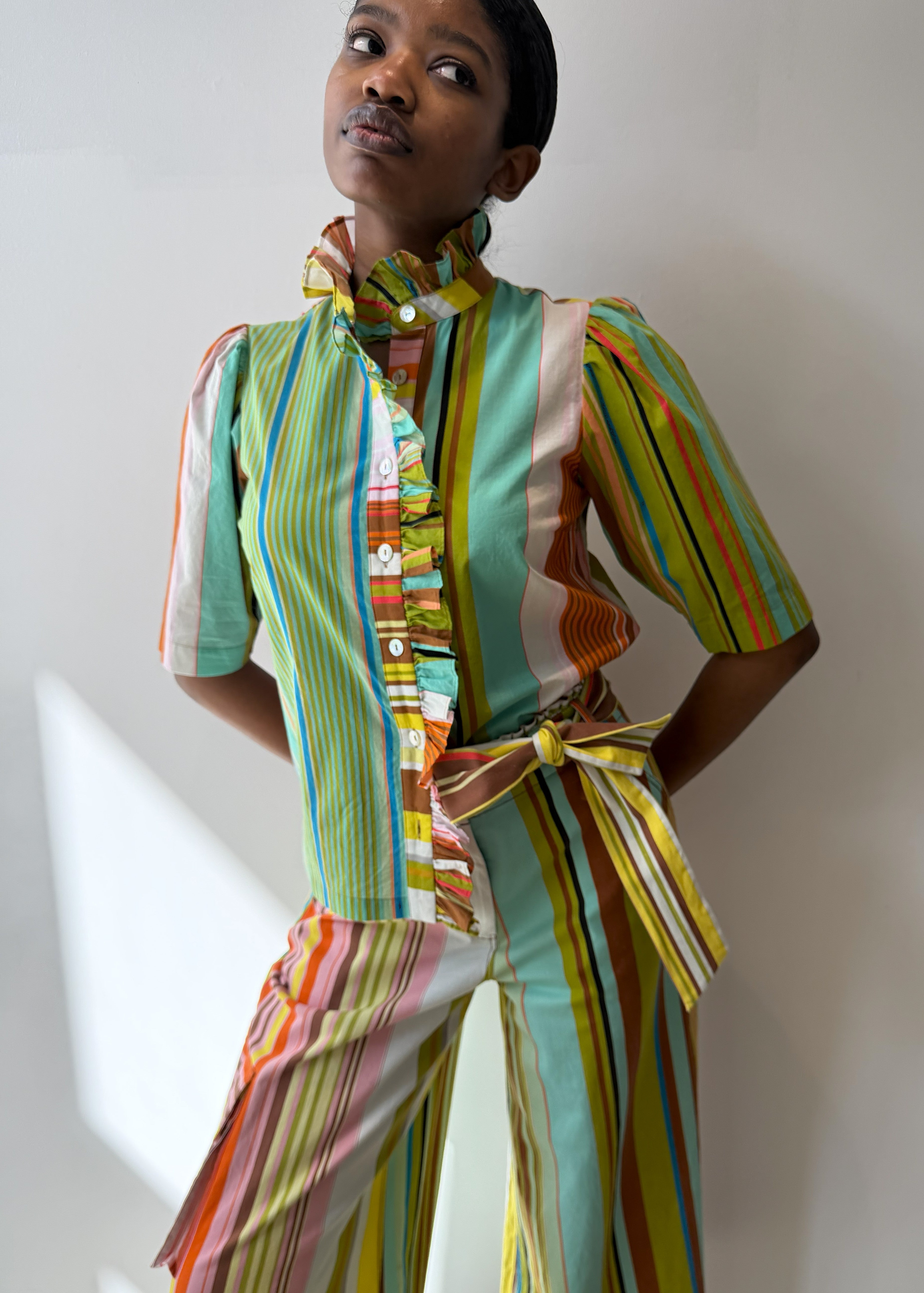 • Sleeveless button down shirt with frill detailing at the collar continuing down the front placket.