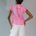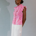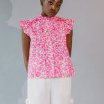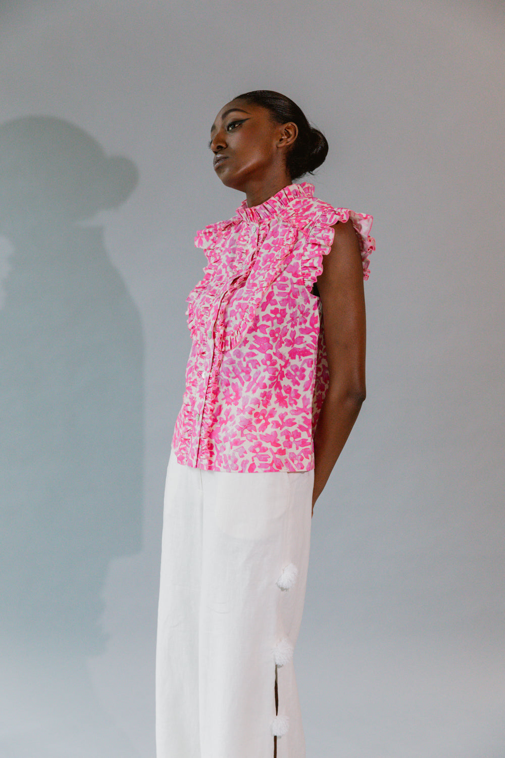 • Feminine shirt with frill detailing at short sleeves, front placket, yoke and bib in crisp cotton poplin