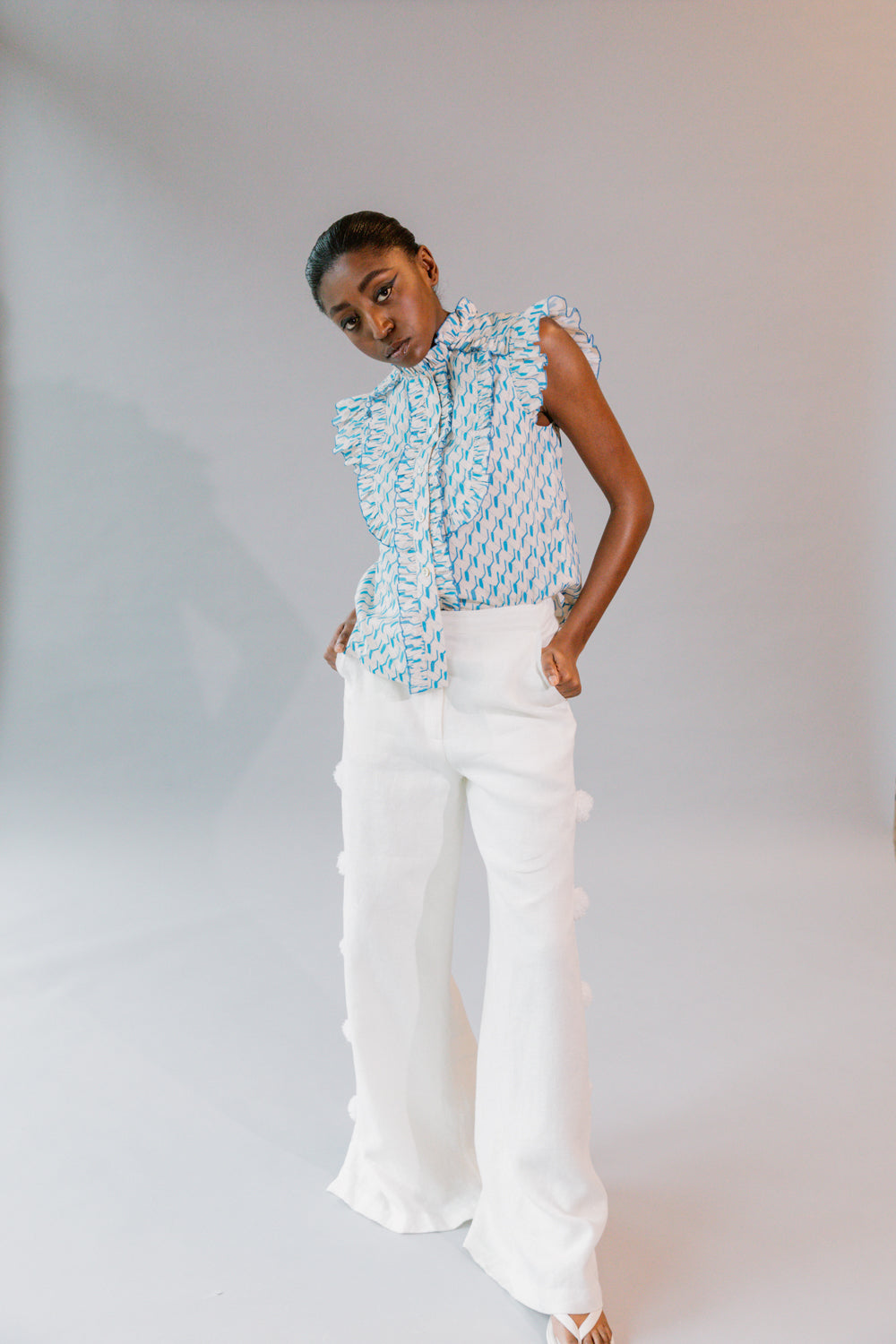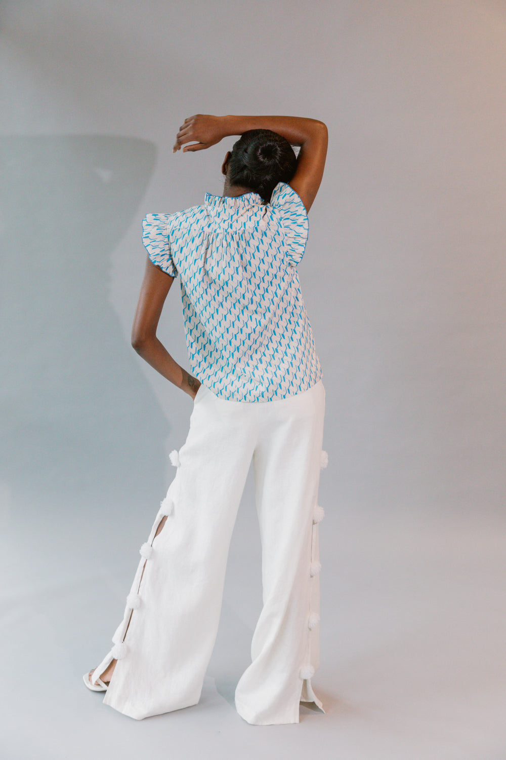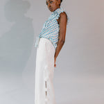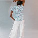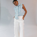• Feminine shirt with frill detailing at short sleeves, front placket, yoke and bib in crisp cotton poplin