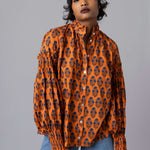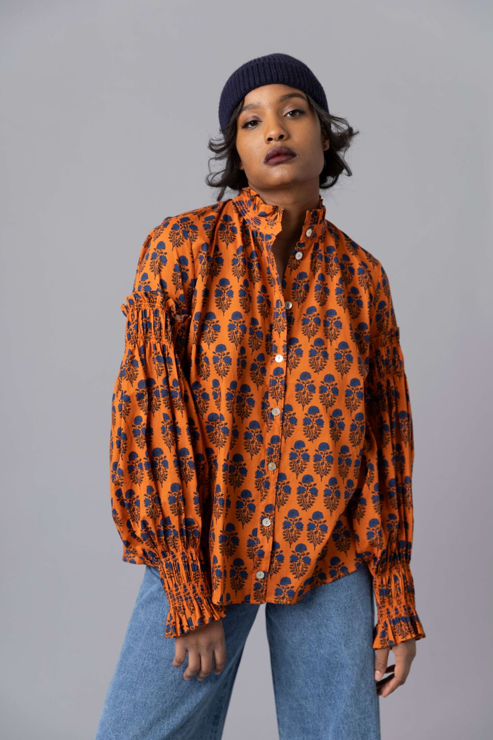 • High neck blouse with dramatic full sleeves frilled neck band and smocked cuffs in lightweight and slightly sheer organic cotton lawn.