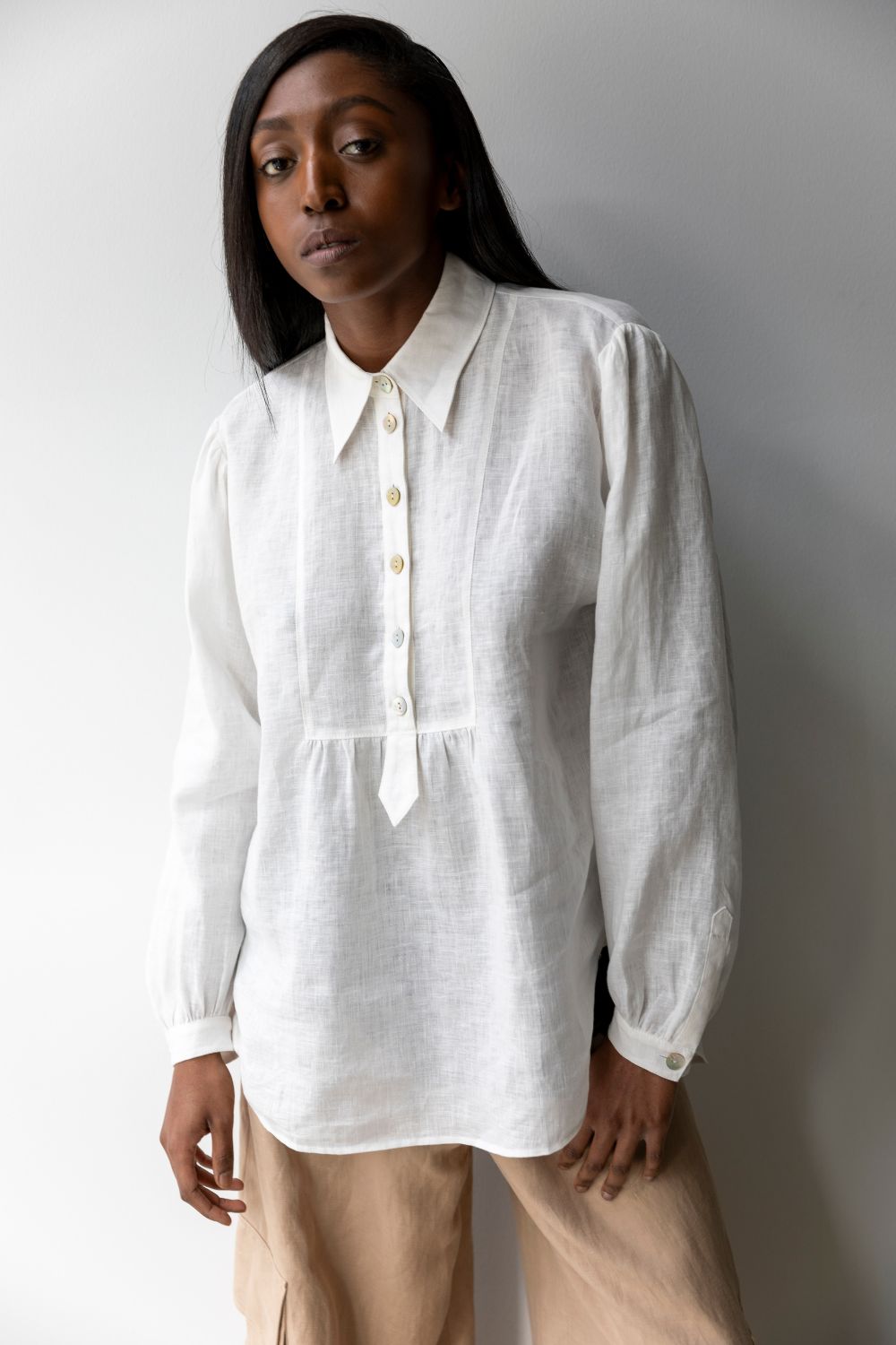 • Akoya shell buttons at CF neck and cuffs and snaps at front placket