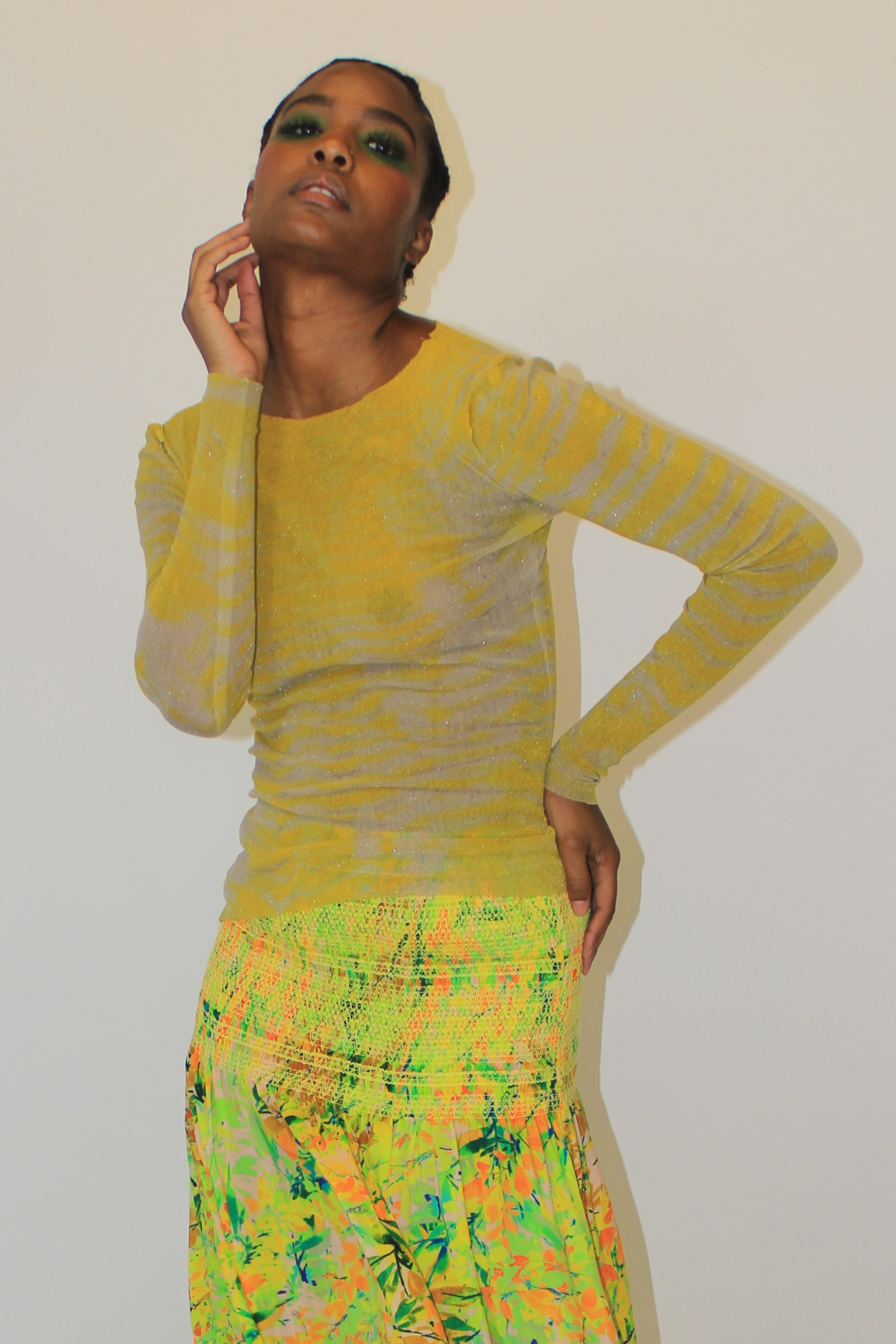 Skinny T has long slim sleeves and is hand-dyed using Shibori dyeing techniques.