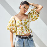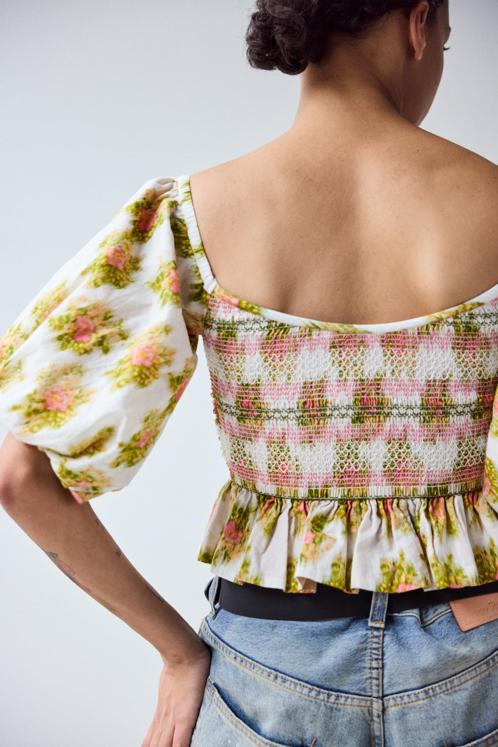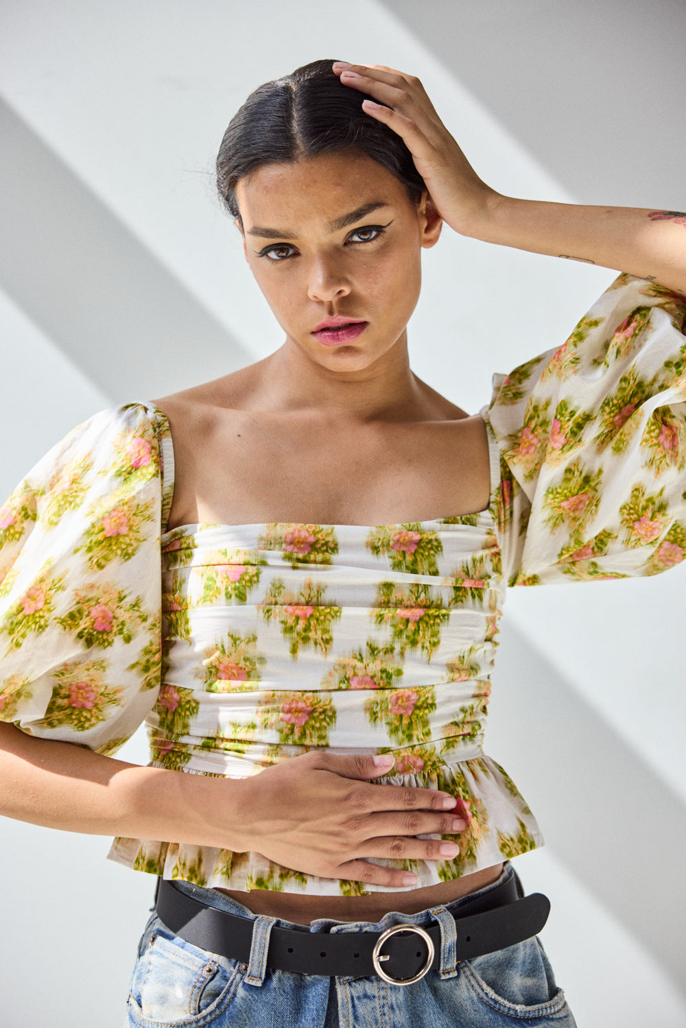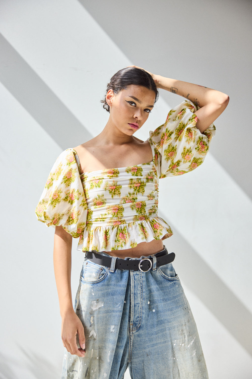 • Ruched off shoulder top with short bubble hem and shirred puff sleeve.
