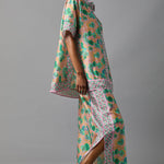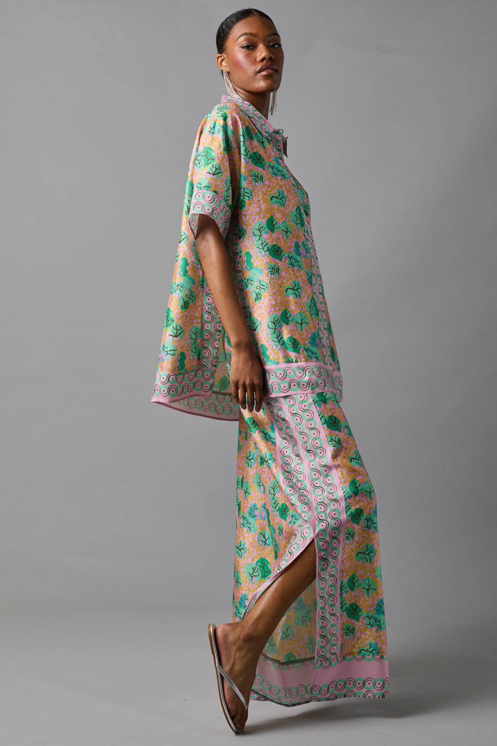• Relaxed, tunic length, short sleeve shirt has high side slits and border print placements at front, hem and sides