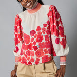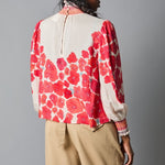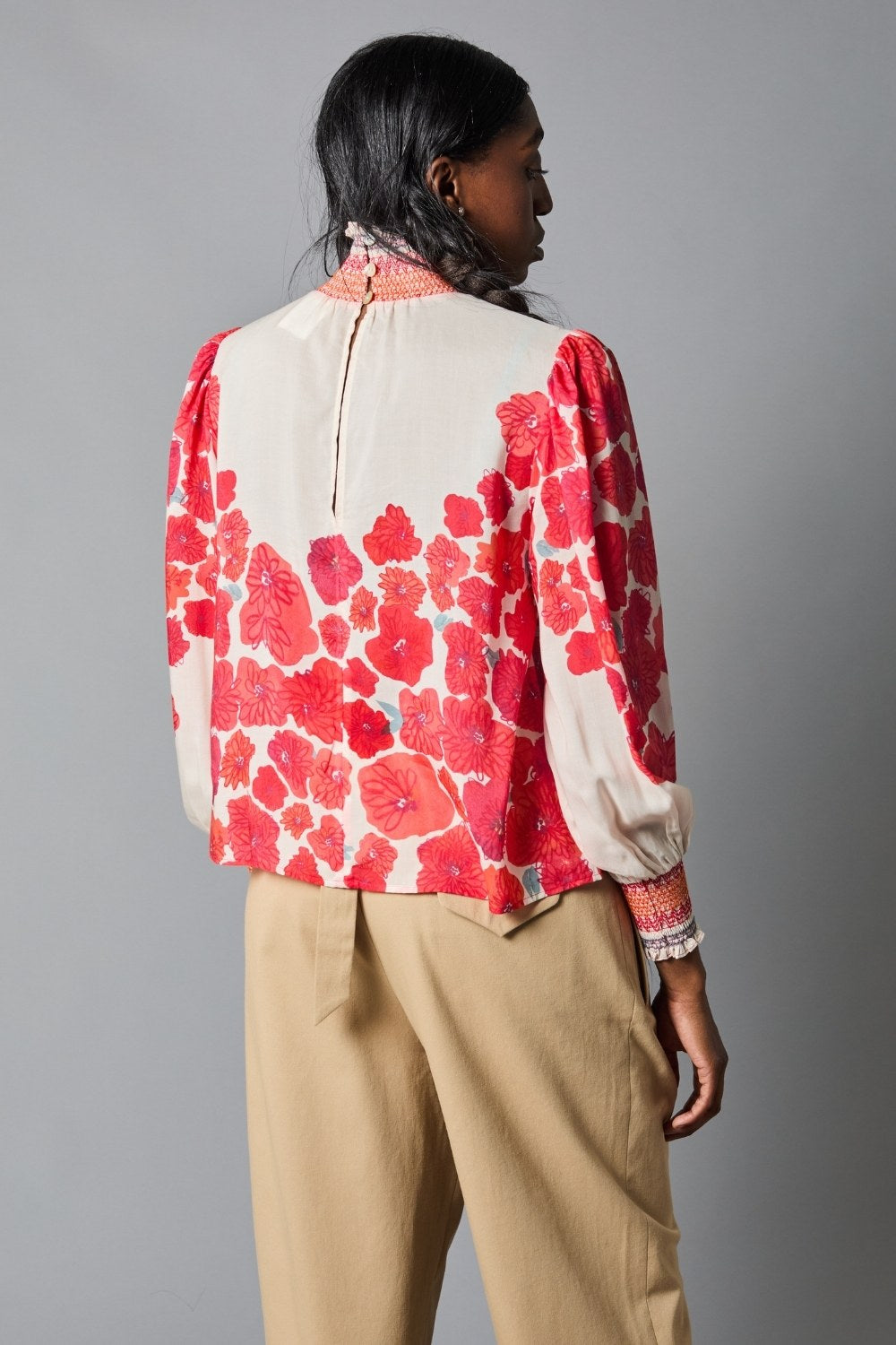 • High necked blouse has a smocked collar and ¾ puff sleeves in a soft and slightly sheer printed Tencel voile.