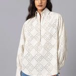 • Raglan sleeve shirt in organic cotton poplin has full sleeves with notched collar and cuff. Embroidered with a vintage geometric eyelet design.