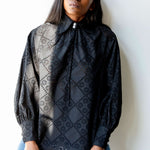 • Raglan sleeve shirt in organic cotton poplin has full sleeves with notched collar and cuffs. Embroidered with a vintage geometric eyelet design.
