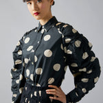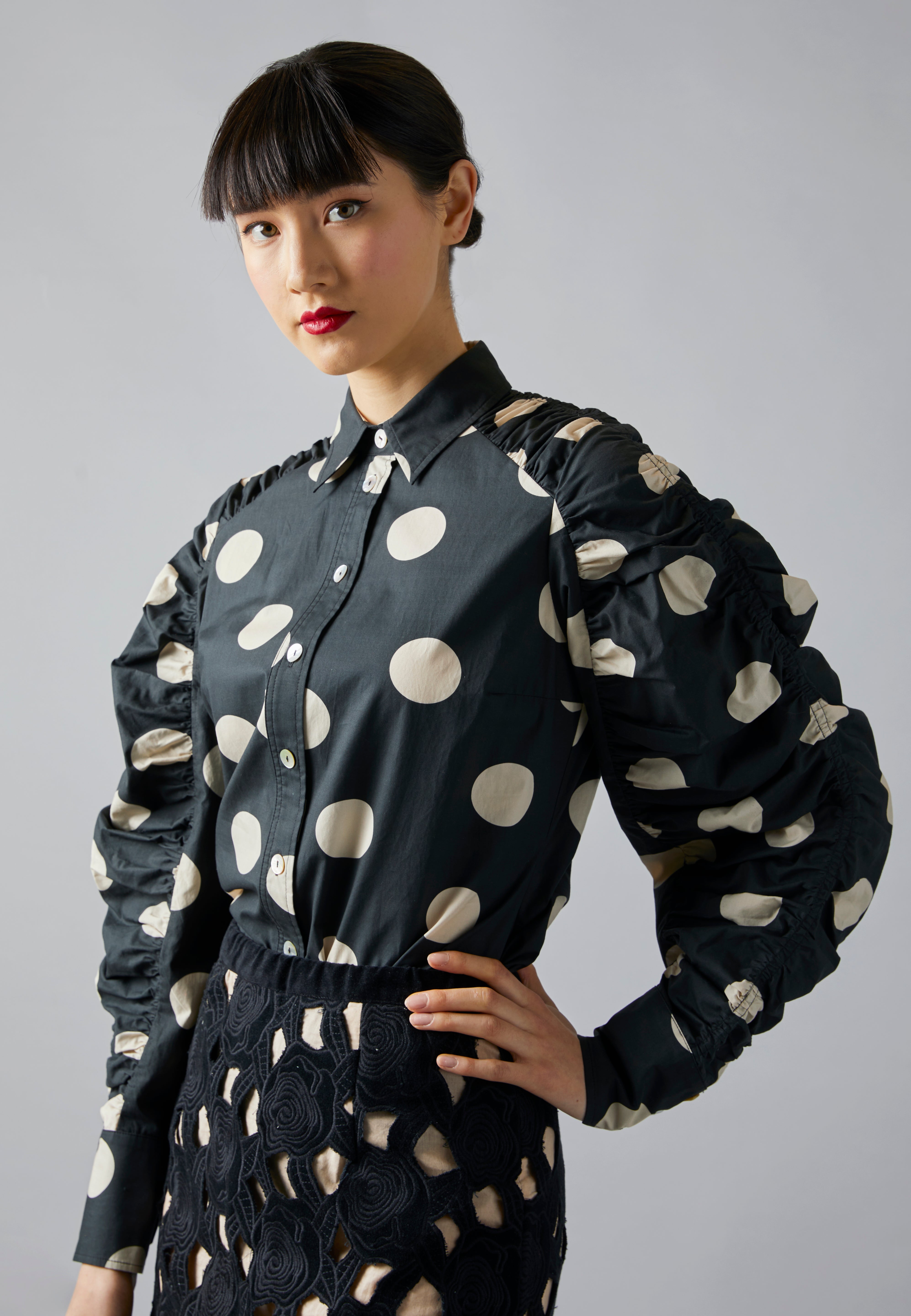 • Tailored button down shirt has voluminous shirred sleeves and shirred shoulder detail.
