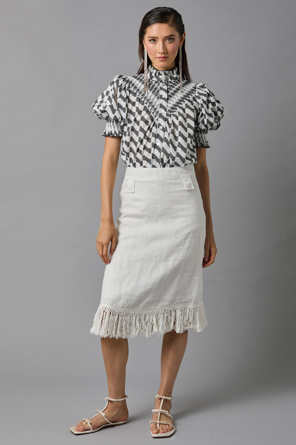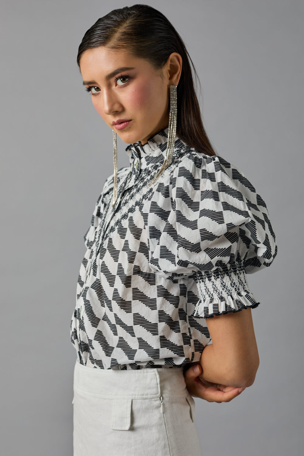 • Classic shirt with smoked yoke and short puff sleeves in a soft organic cotton lawn.