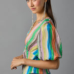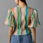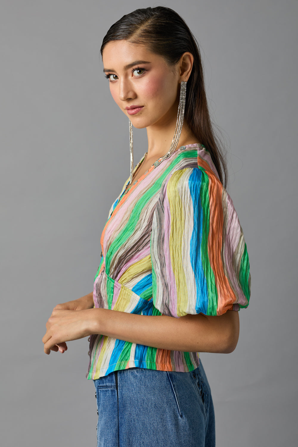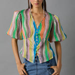 • Crinkled, puff sleeve blouse has vintage details and a fitted waist with corset seams. Button and loop details adorn the front from shoulder to hem.