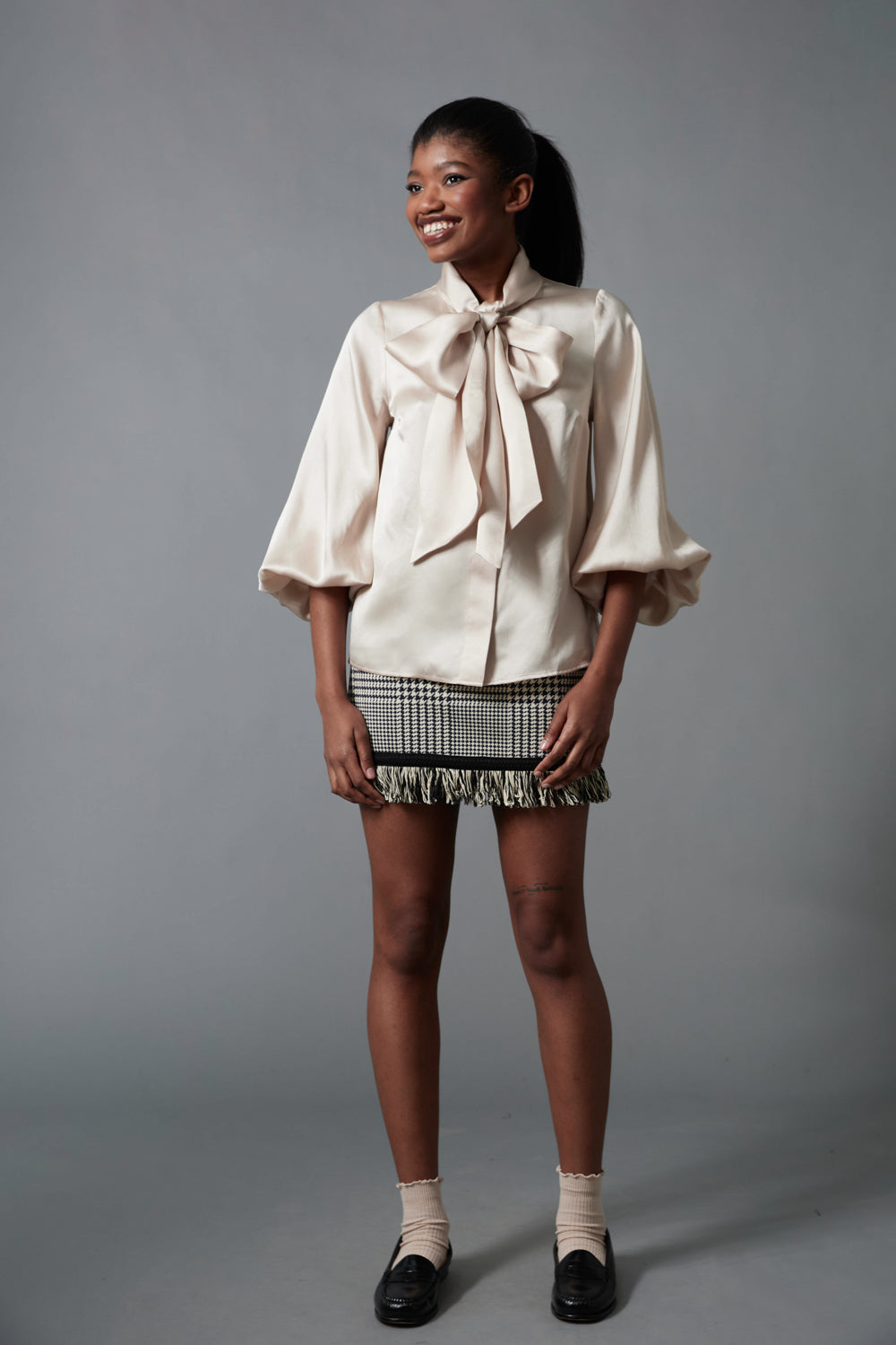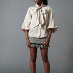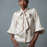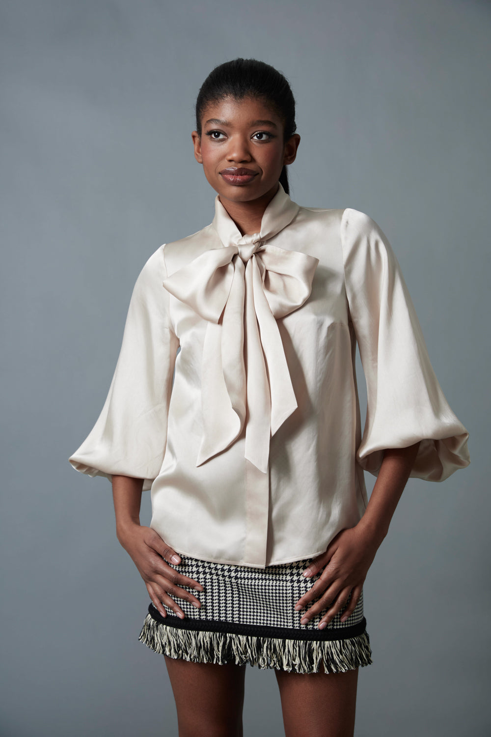 • Soft blouse has wide ties at the neckline to create a dramatic bow when tied. ¾ length bell sleeves has elasticated cuffs. Hidden buttons at front placket.