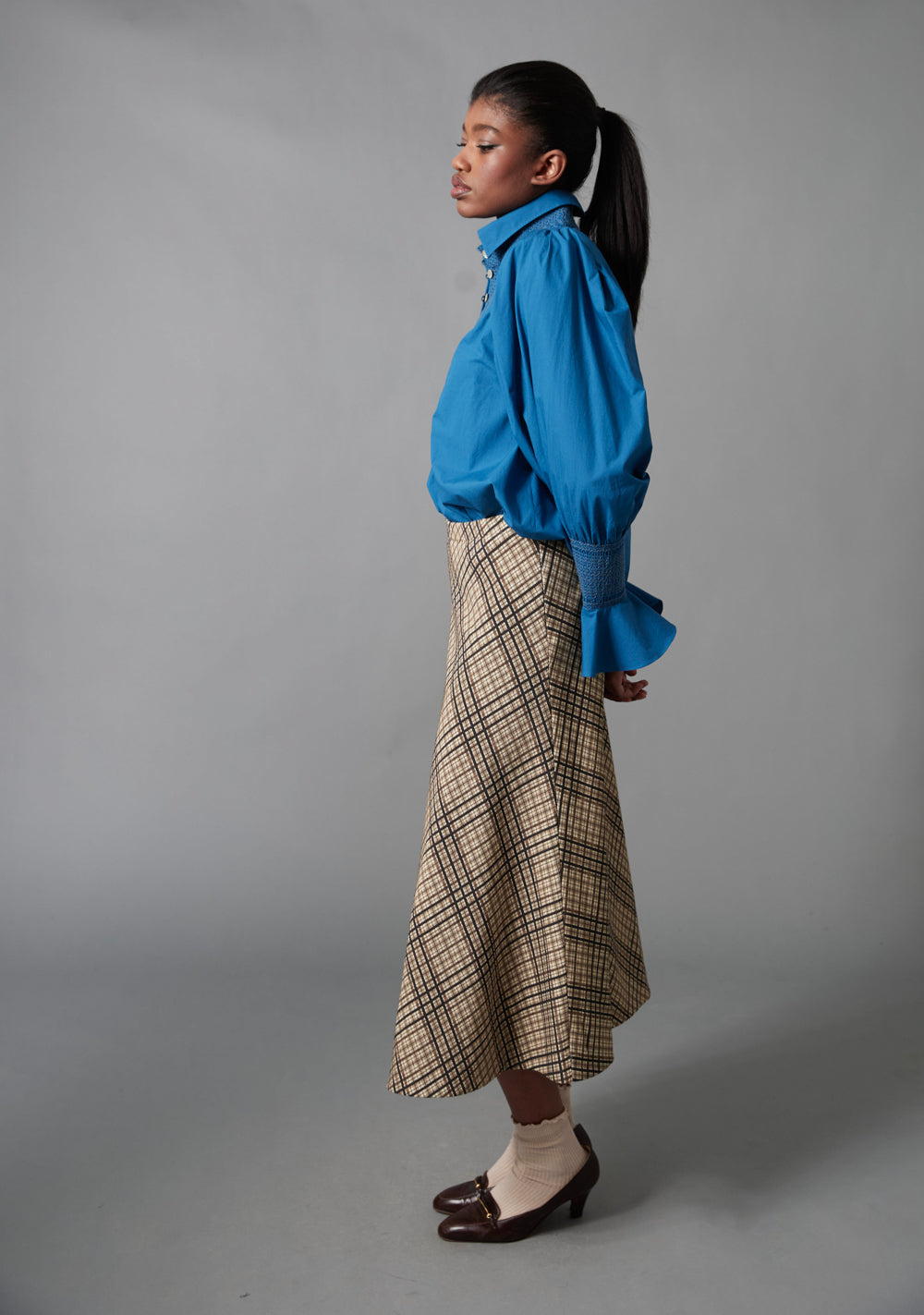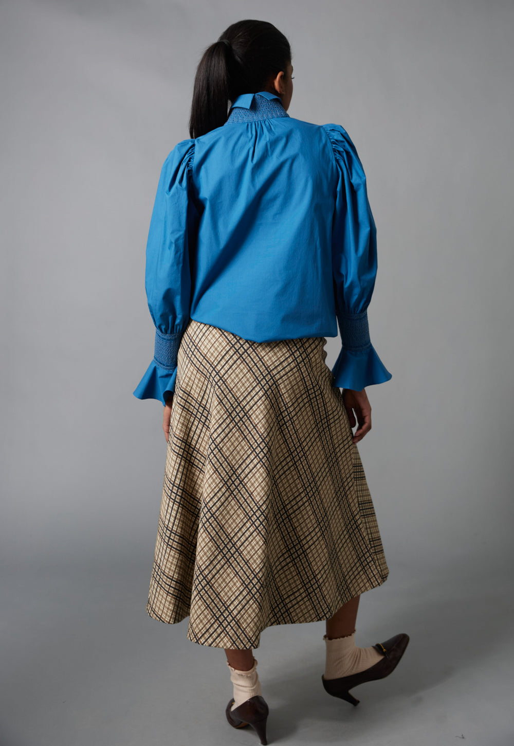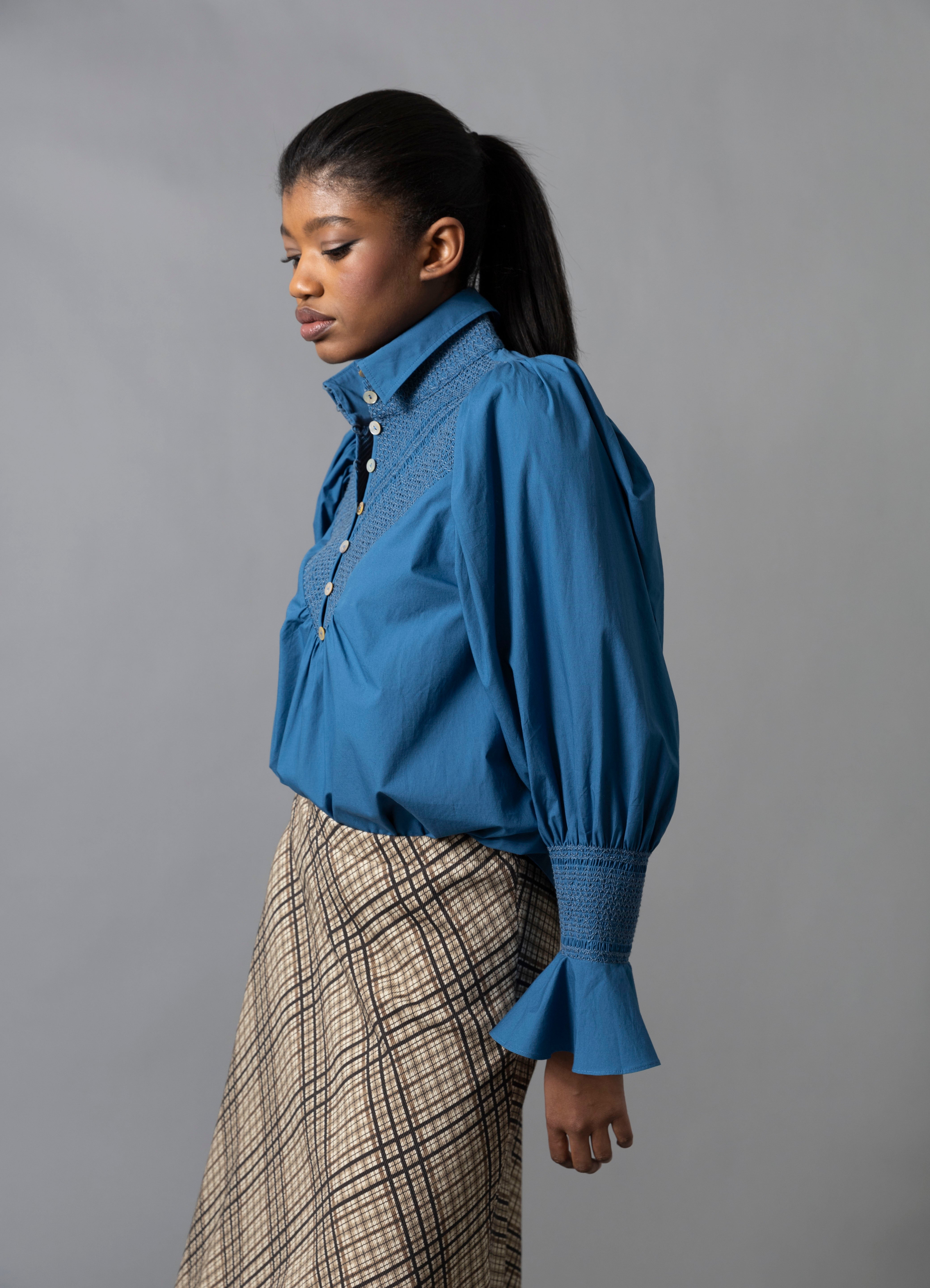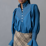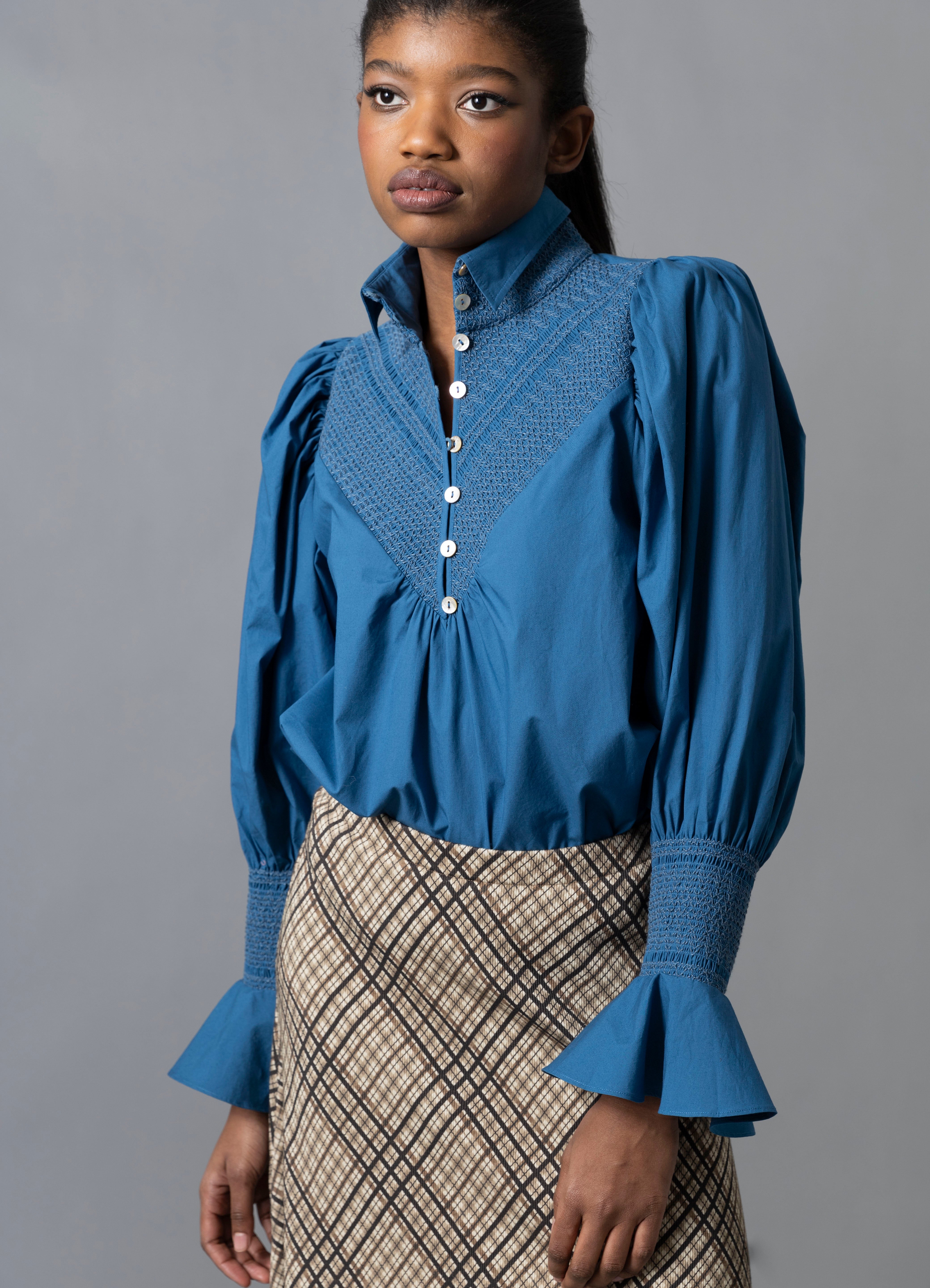 • A Hope for Flowers best seller. This shirt has a smocked yoke, full length flounced sleeves smocked at the wrists, and Akoya shell buttons at front placket