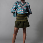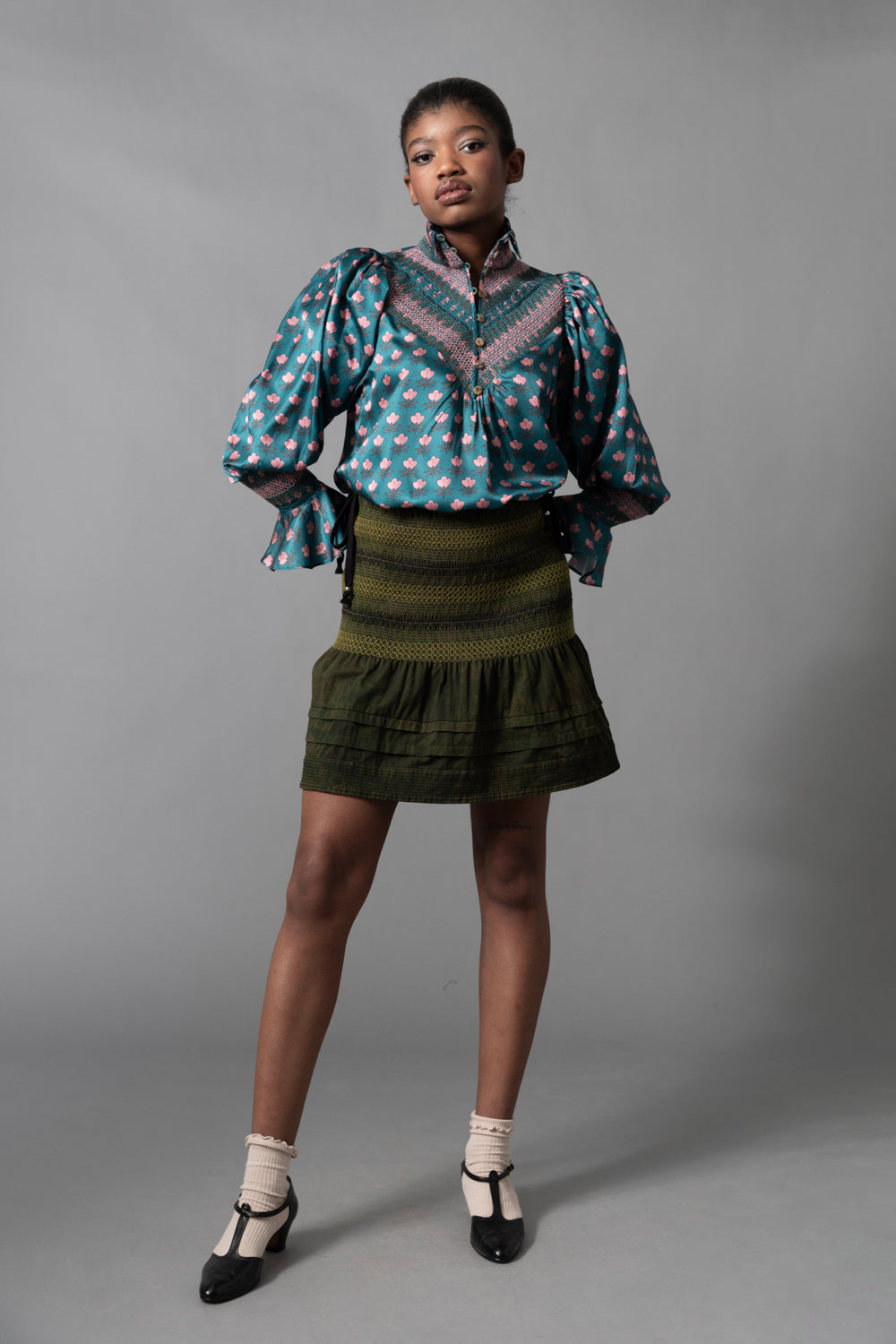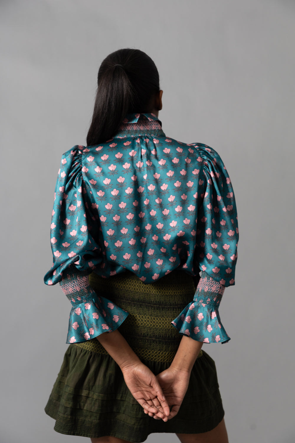 • A Hope for Flowers best seller updated in soft Tencel voile. This shirt has a smocked yoke, full length flounced sleeves gathered at the wrists, and Akoya shell buttons at front placket